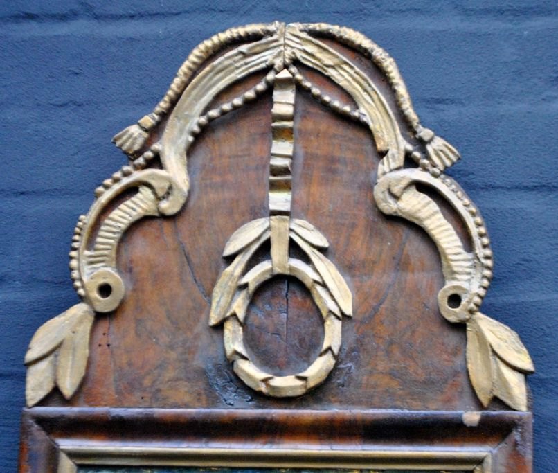 Dänischer Louis-XVI-Spiegel, Nussbaumfurnier, um 1780. Höhe: 70 cm. Breite: 34 cm.