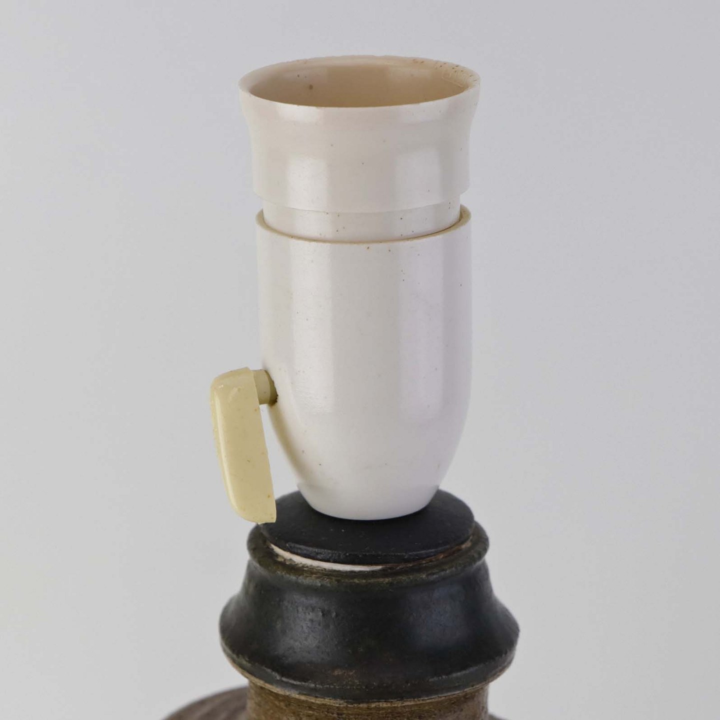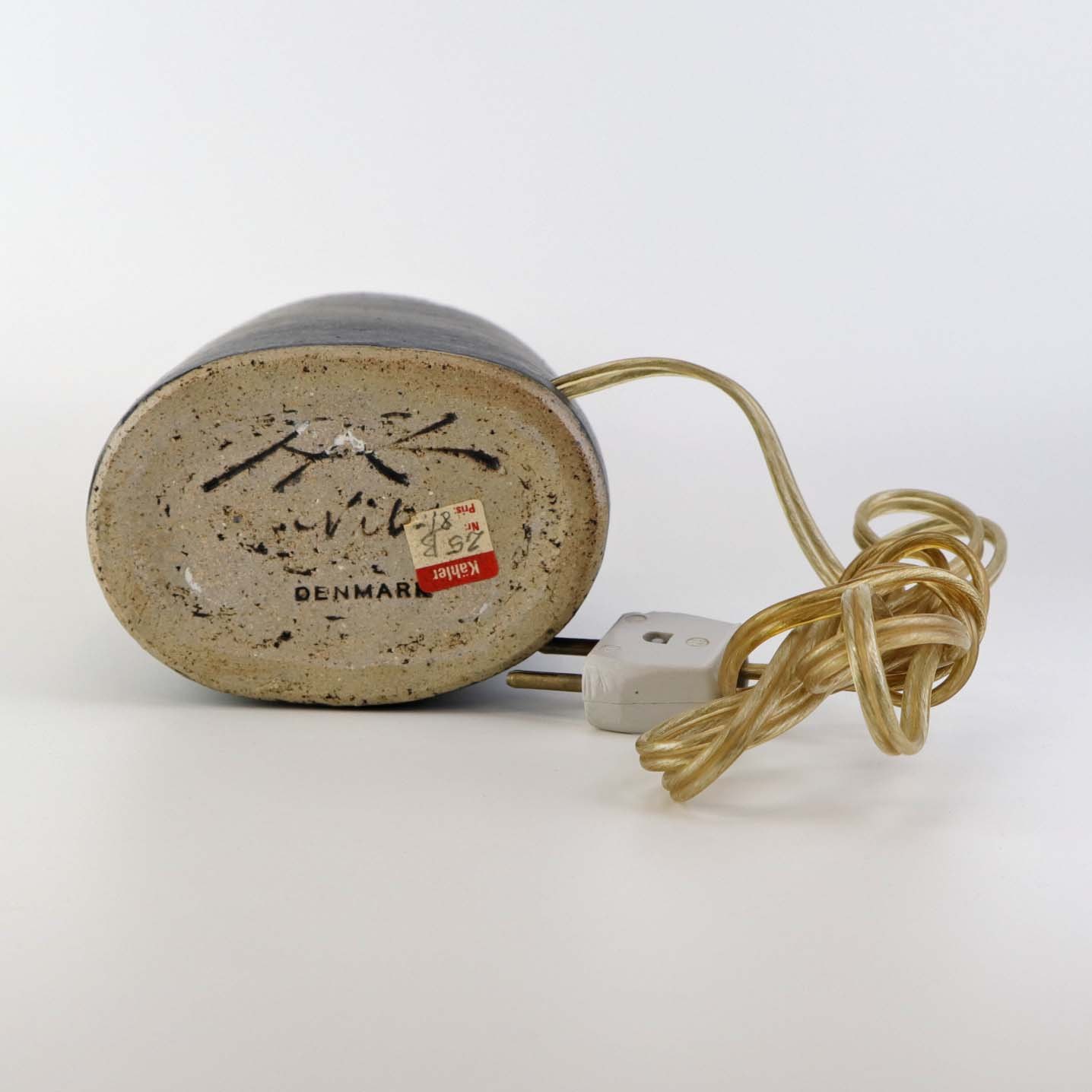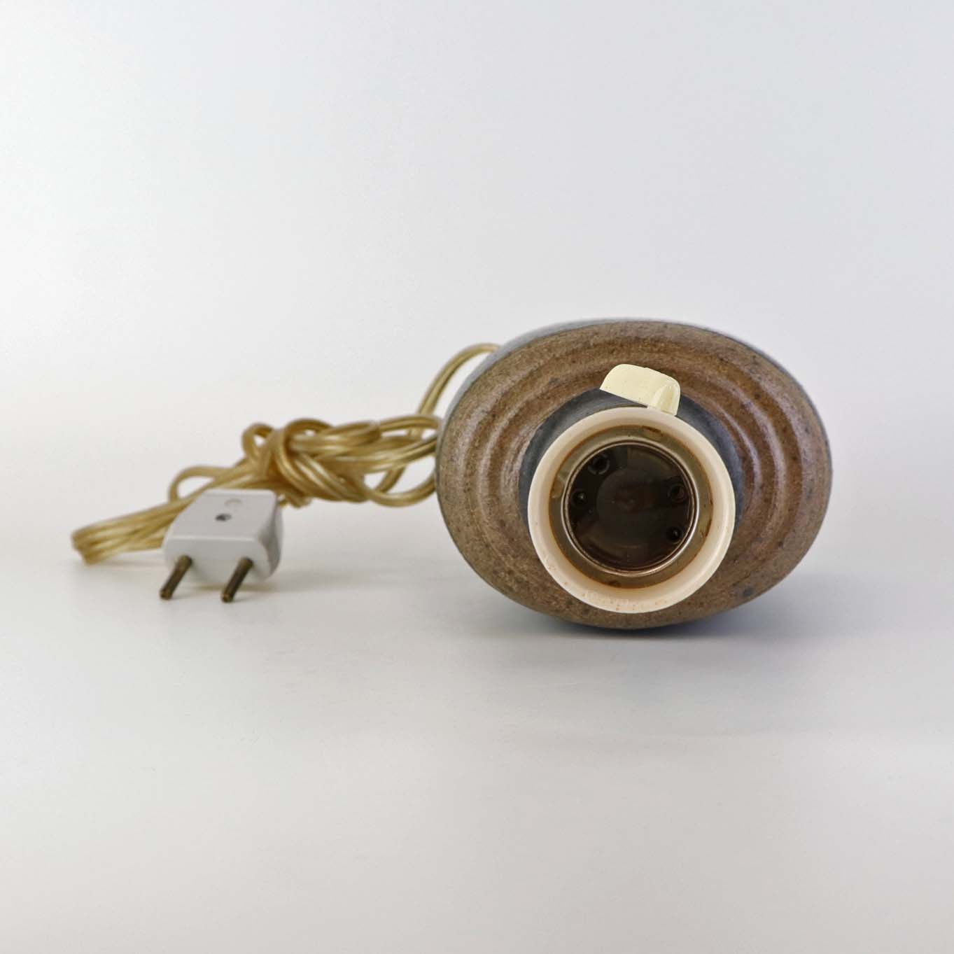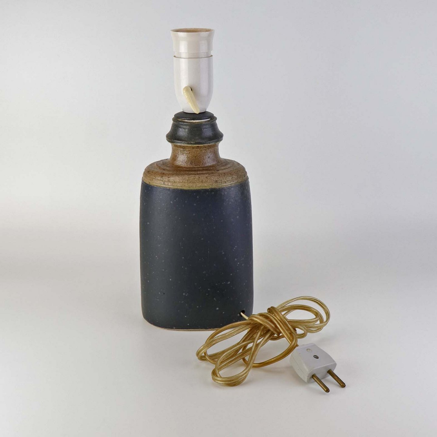 Oval lampefod i keramik med brun og blåsort glasering og lys plastfatning.