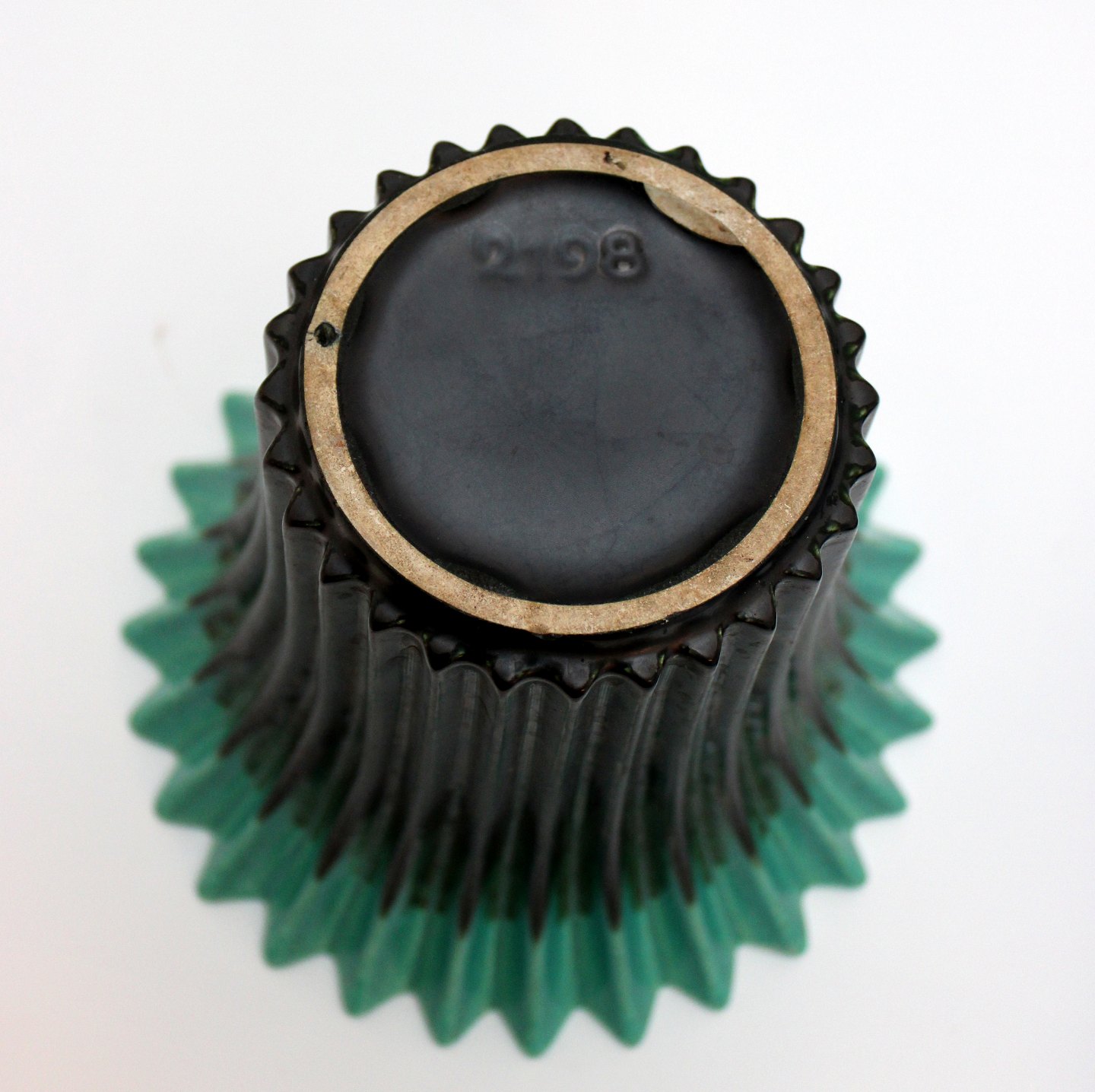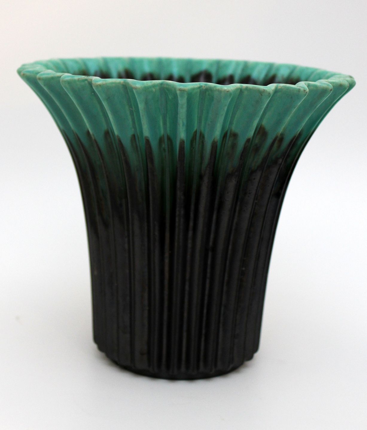 Text zugänglich auf Dänische: Sort rillet keramik vase med turkis kant. Nr. 2198. Kender ikke keramikeren eller fabrikken. Men vasen er meget dekorativ og anvendelig. Fin stand, bred kalkagtig rand indvendig. Højde 17,5 cm. Øverste diameter 19,5 cm. Nederste diameter 10 cm. Pris: 375 kr. Lager: 1