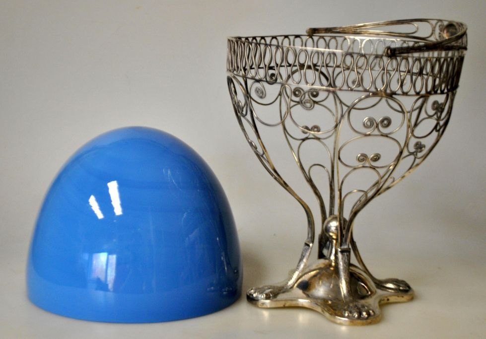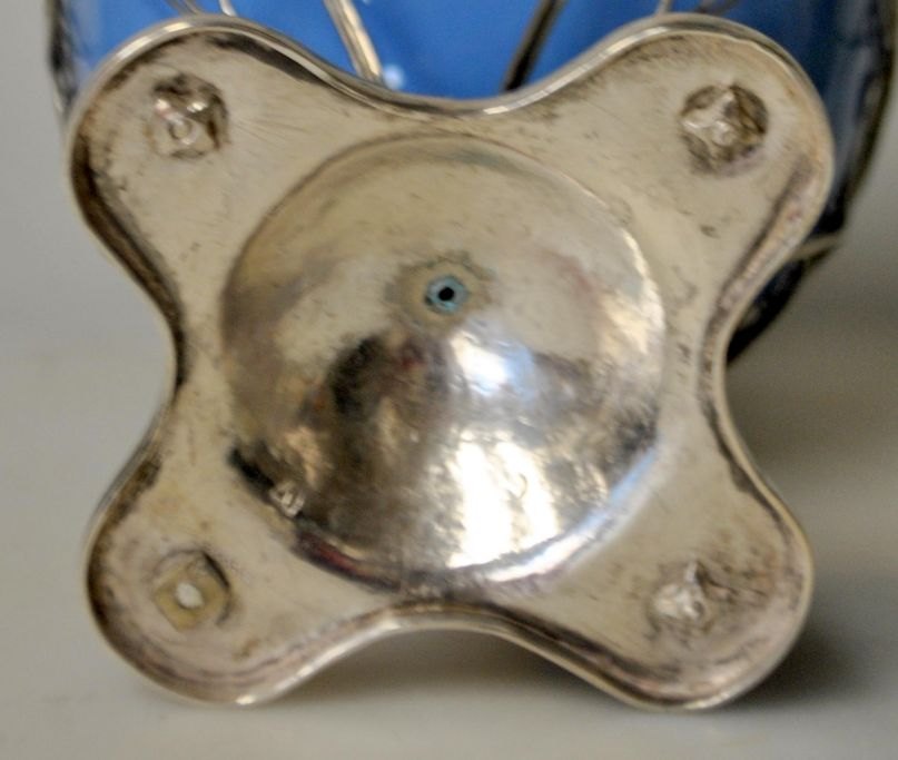 Jacob Wilhelm Ryder (1787–1853), Kopenhagen, Dänemark: Große Zuckerschale. 18. Jahrhundert, Empire-Stil. Mit hellblauem Glaseinsatz. Mit Henkel. Filigranarbeit. Gestempelt mit Meistermarke, Stadtwappen, Wächtermarke und Monatsmarke. Höhe: 16 cm. Höhe mit Henkel: 21,5 cm. Gewicht (Silber): 158 Gramm.