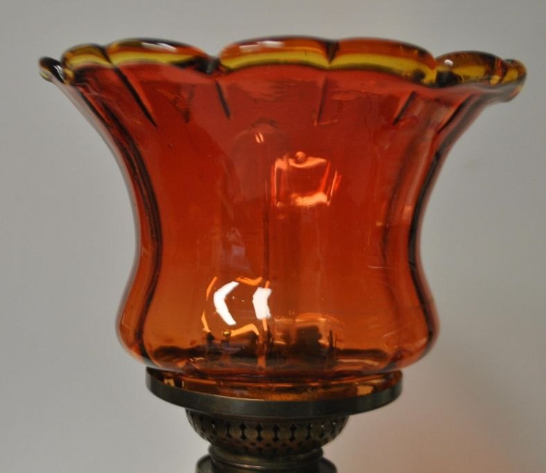 Petroleumlampe aus rotem Glas mit gelben Rändern, um 1900, Dänemark.