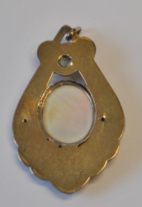 Holger Fischer (1893–1937), Kopenhagen, Dänemark: Vergoldete Brosche. Mit Perle und Kamee mit Diana im Profil. Gestempelt. Höhe: 5,5 cm.