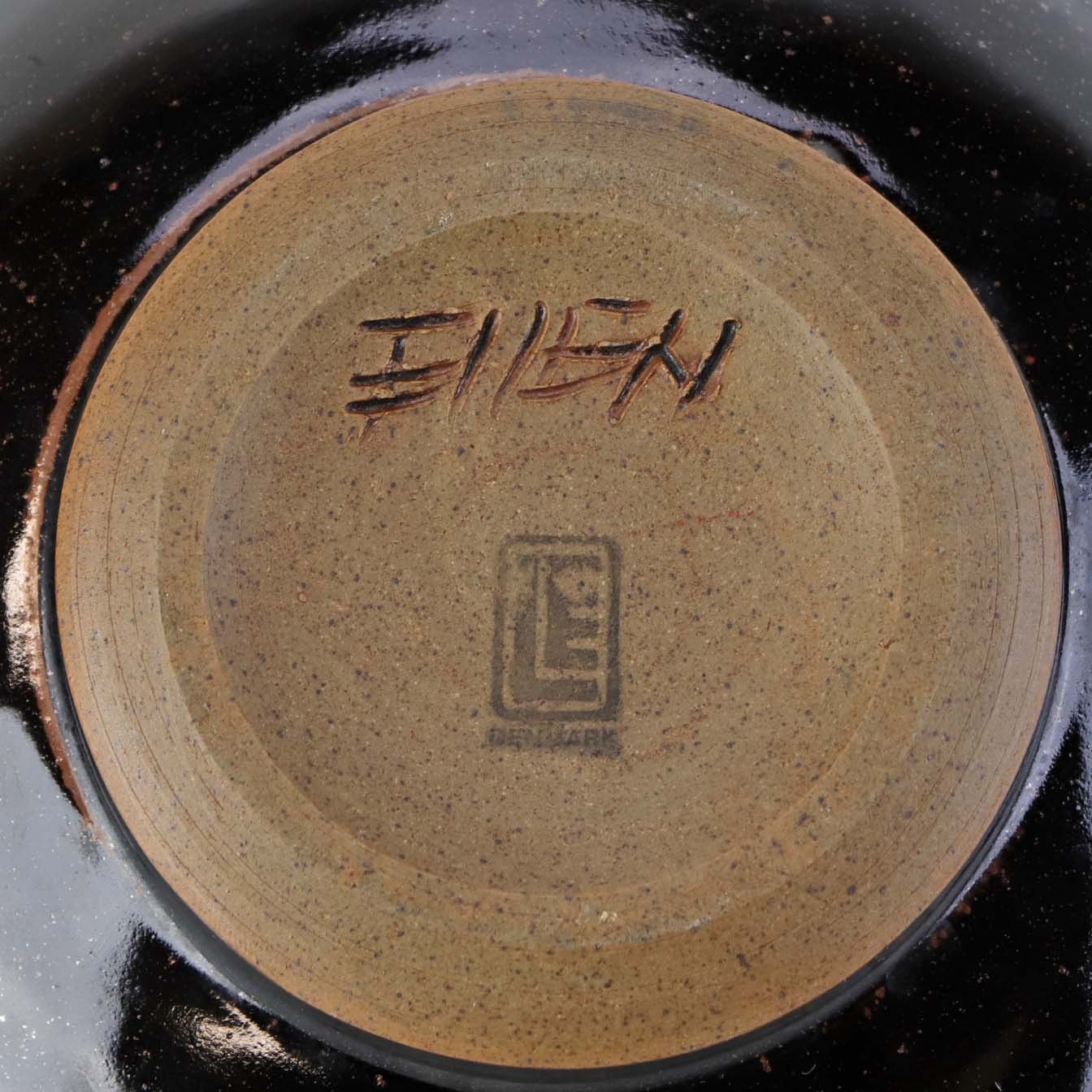 Skål i stentøj med delvist nubret glasur i brunlige nuancer og cirkelformet mønster i bunden.