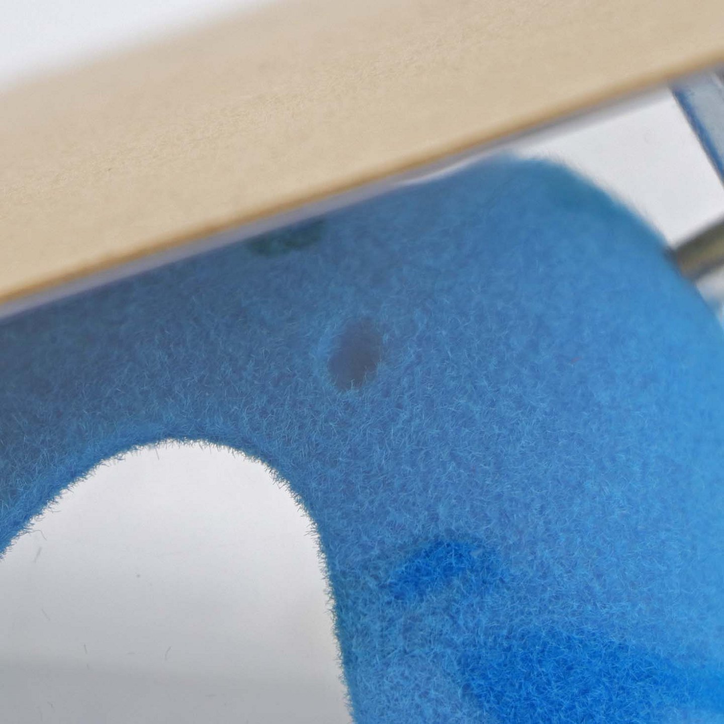 Fremstår med hvad der kan se ud som lettere blegning af stoffets farve samt en rund uddybning ved stolens bagside.