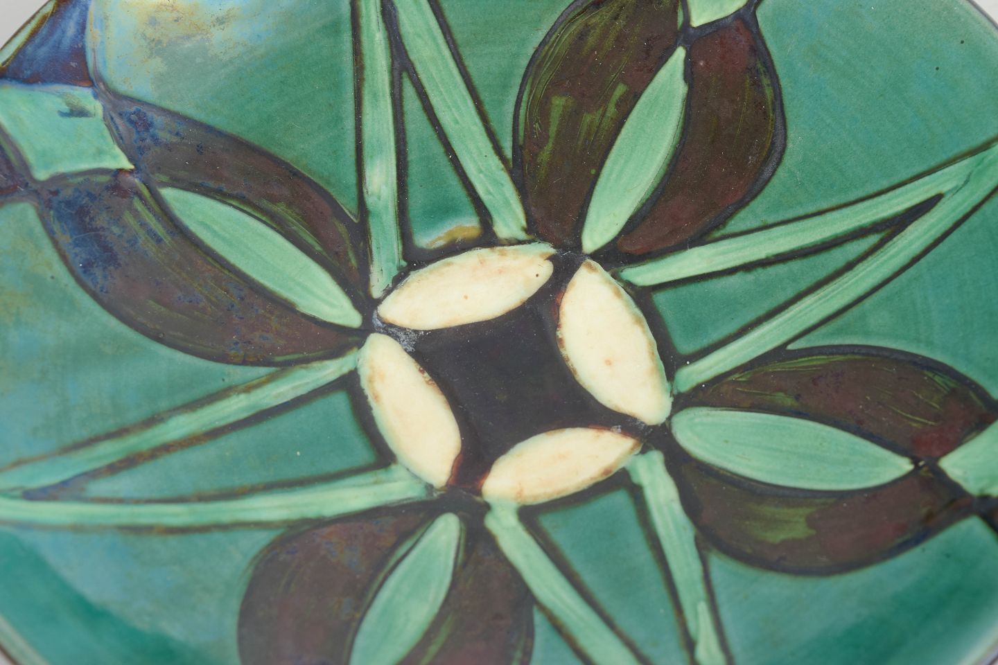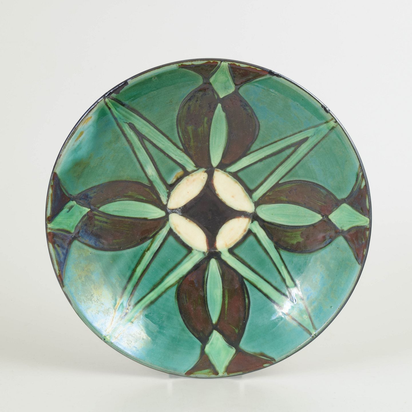 Håndglaseret skål i keramik med geometrisk dekoration i grønne og brune nuancer. Klassisk Art Deco-udtryk med tydelig værkstedsmæssig karakter, udført med levende glasur og håndmalede detaljer.