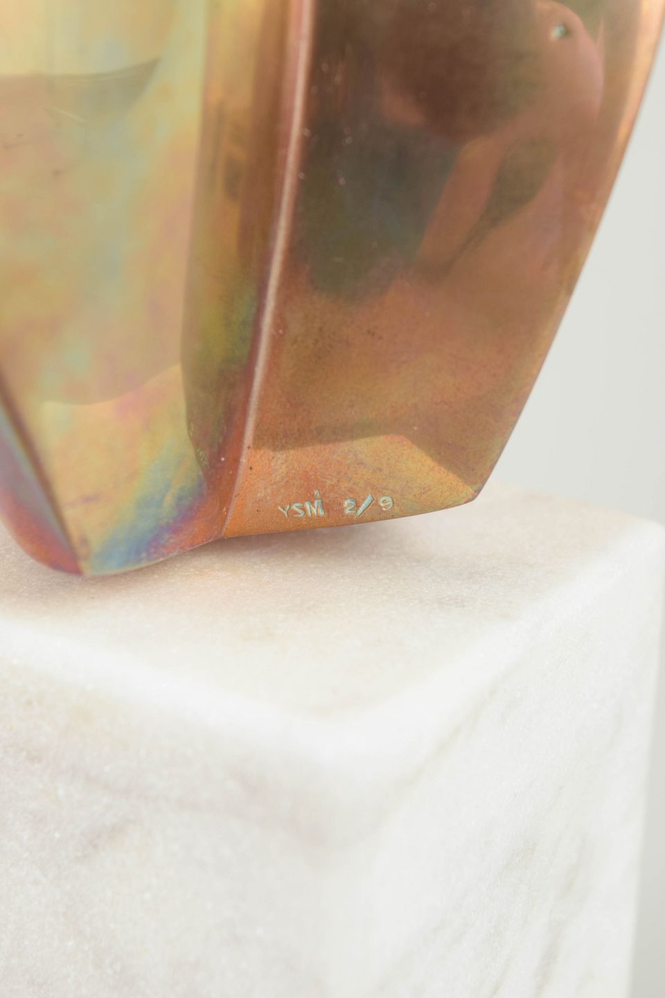 Abstrakt, organisk formet skulptur i massiv bronze med varm, nuanceret patina, monteret på rektangulær marmorsokkel. Skulpturen er signeret og nummereret 2/9.