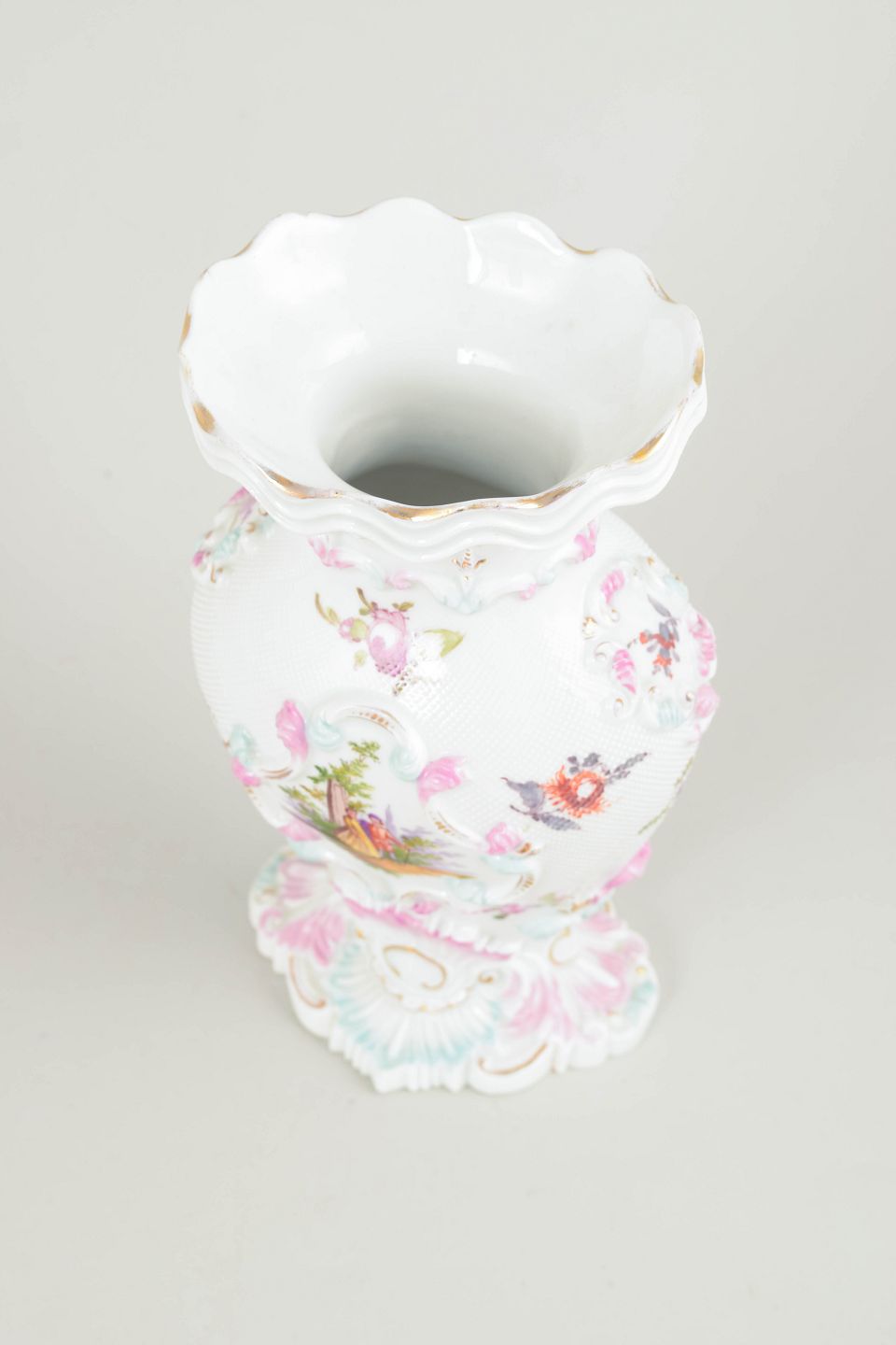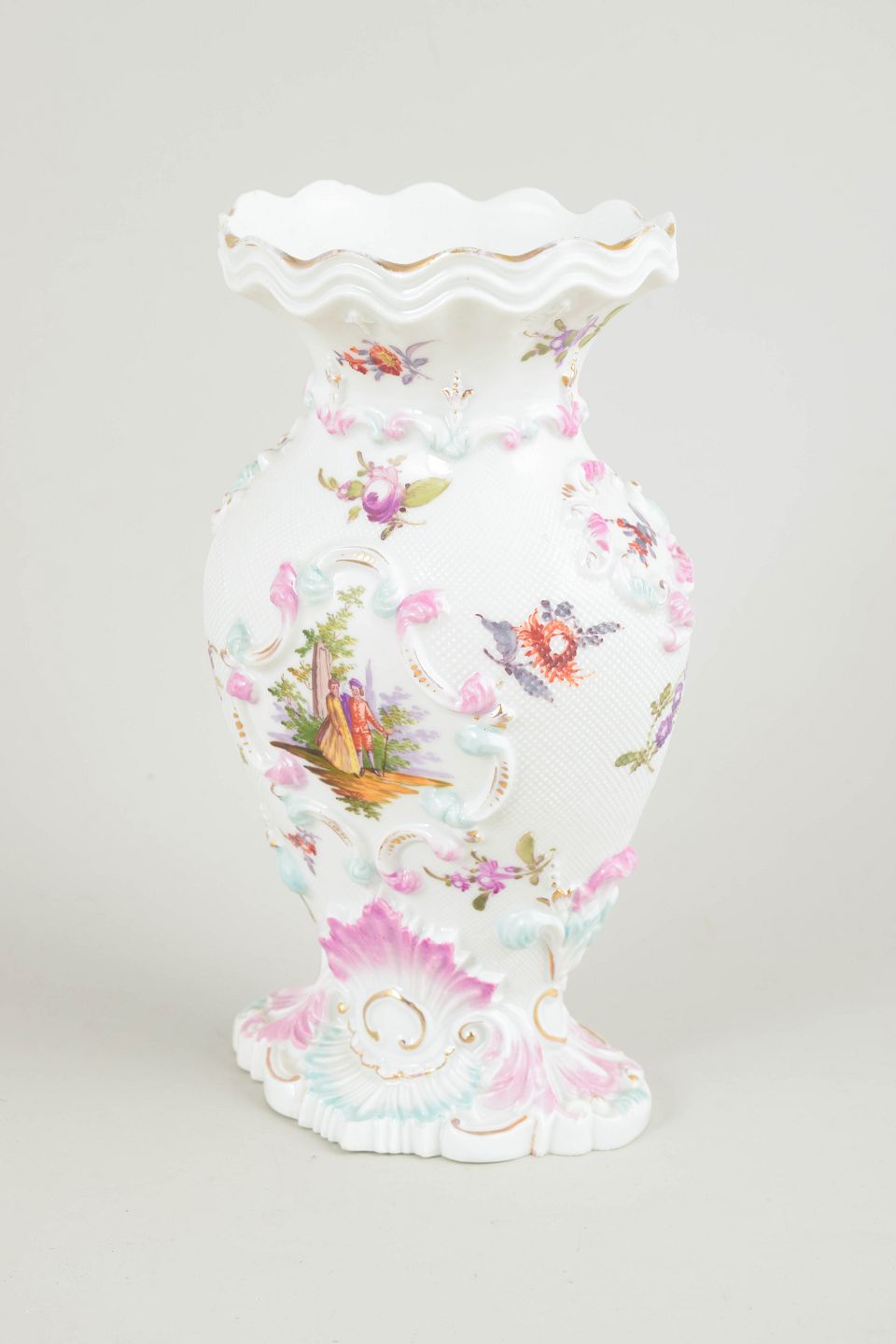 Sjælden vase i hvidt porcelæn rigt dekoreret i relief og med håndmalede polykrome blomster- og landskabsmotiver. Profileret fod og bølget munding. Et fint eksempel på Meissens dekorative porcelænskunst fra det tidlige 19. århundrede.