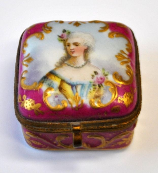 Pillendose aus Sèvres-Porzellan, 19. Jahrhundert. Frankreich. Handbemaltes Porzellan mit Rokoko-Frauenmotiv. Hellrot mit Rokoko-Vergoldung. Innen vergoldet. 4,5 x 4,5 x 3 cm. Einwandfreier Zustand!