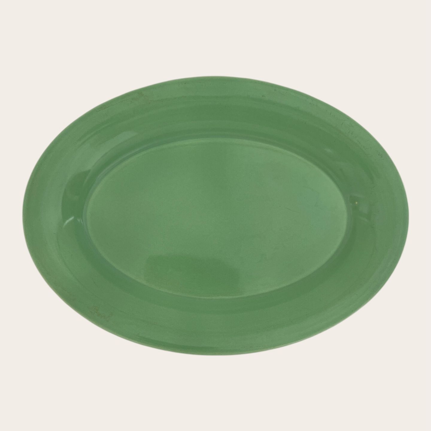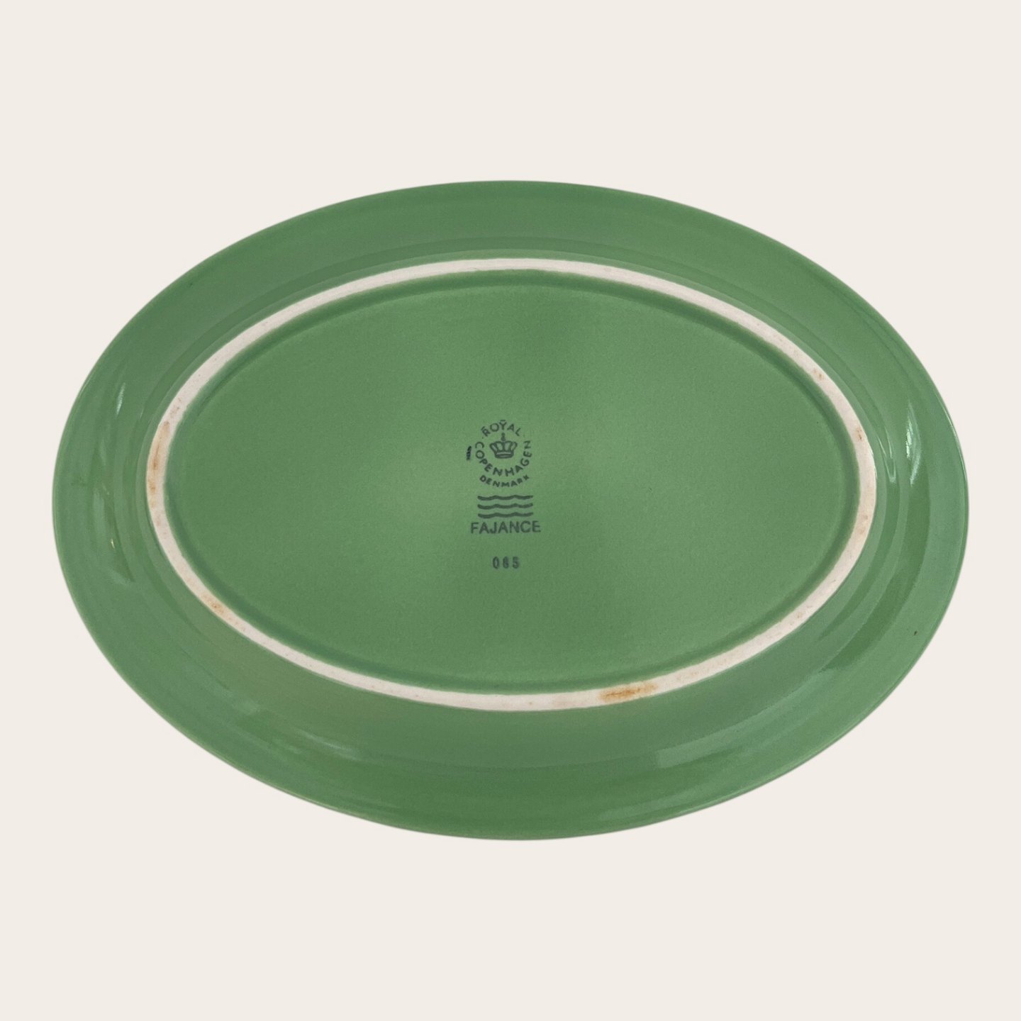 | Royal Copenhagen, Aluminia, Teller, Hellgrün Nr. 085, 1. Sortierung, 22 cm lang, 16 cm breit, Design Ursula Munch Petersen *Guter Zustand*