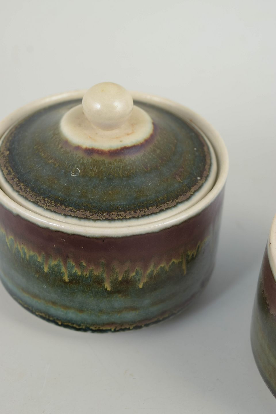 Par drejede lågkrukker i stentøj med cylindrisk form og tilpassede låg med knop. Udført med levende, flerlaget glasur i afdæmpede nuancer af grøn, blå og brun med lys rand og markant horisontalt glasurspil. Signerede i bunden og produceret hos Höganäs i 1970’erne.