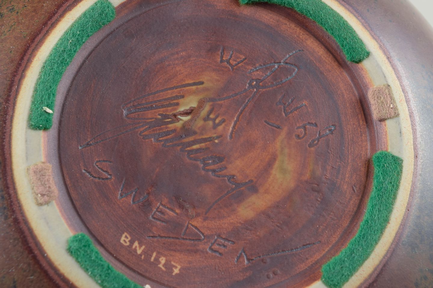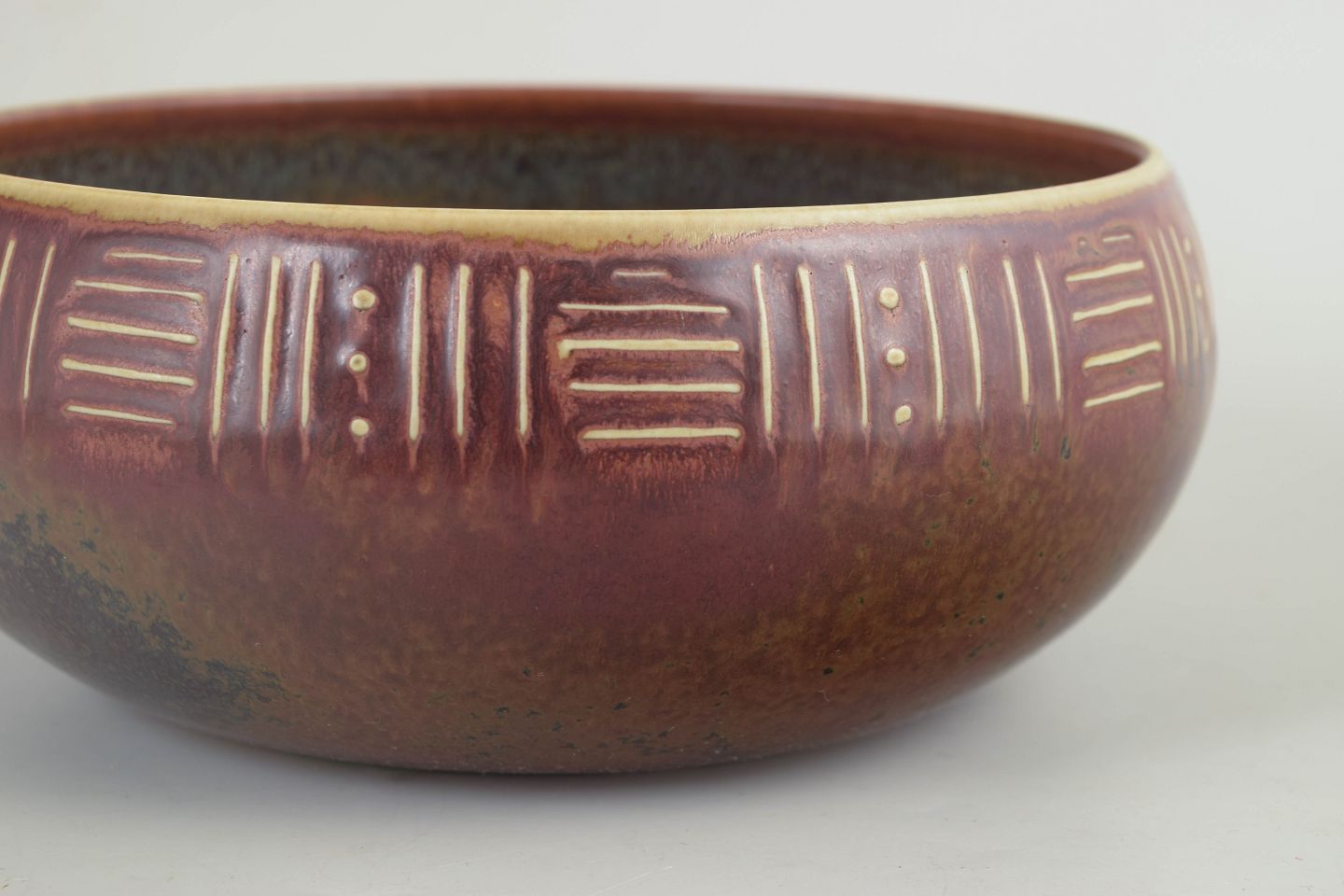 Unika, hånddrejet skål i stentøj med lav, afrundet form. Udført i varm brunrød glasur med mørkere inderside og dekoreret med indskårne, rytmiske linjer, karakteristisk for Carl-Harry Stålhanes eksperimenterende arbejder hos Rörstrand i slutningen af 1950’erne. Et tydeligt studiopræget værk med stærk materialefornemmelse og grafisk overflade.
