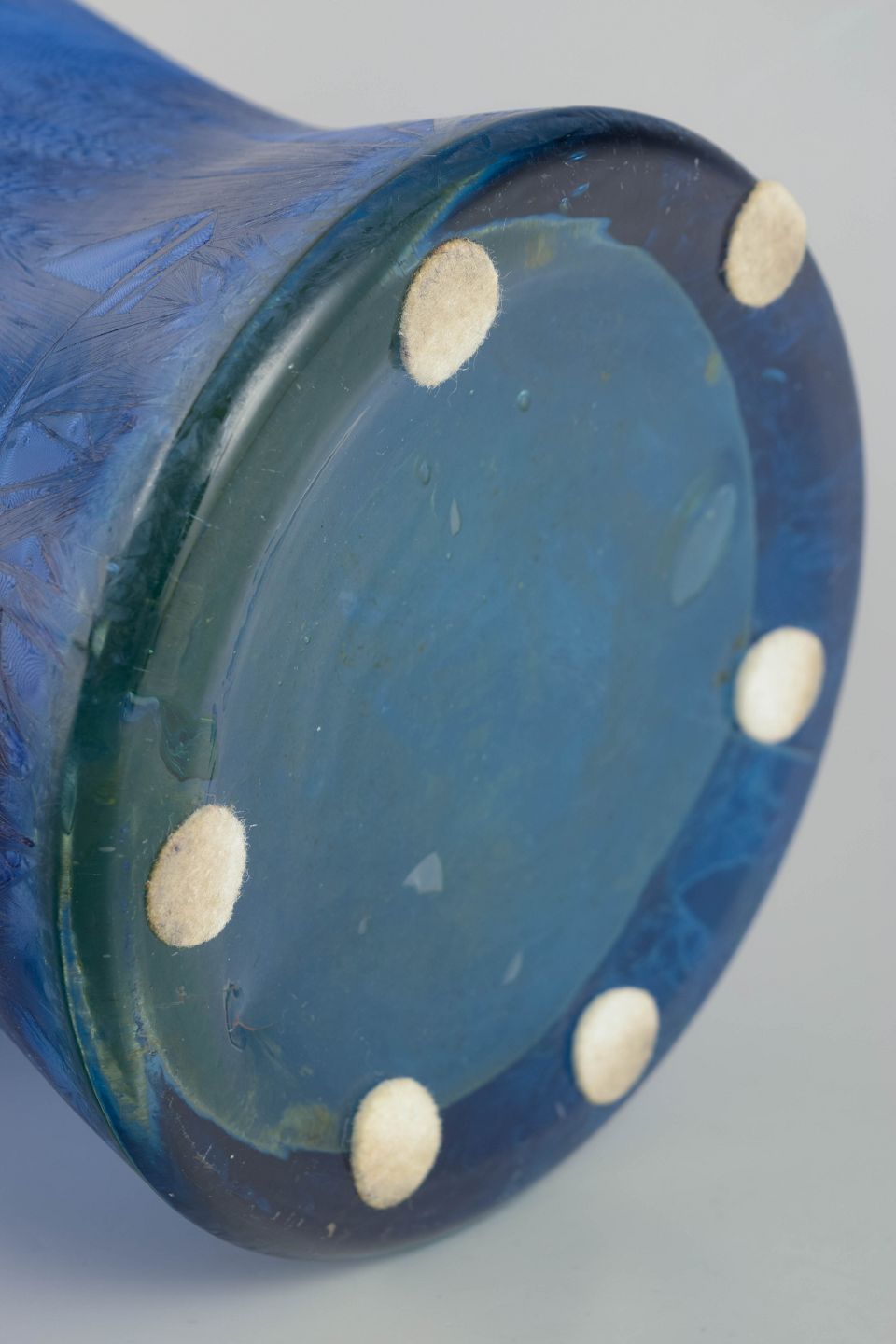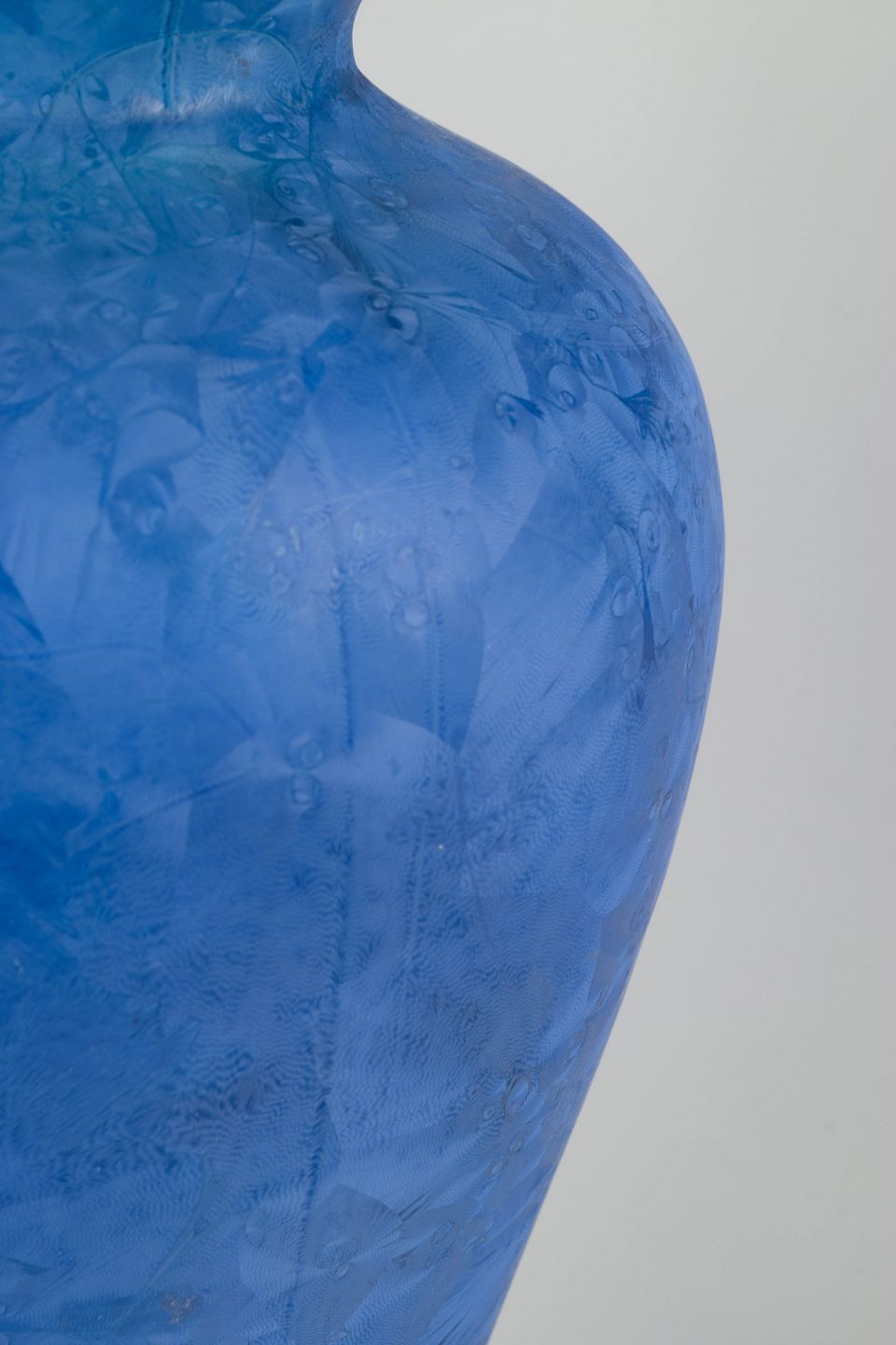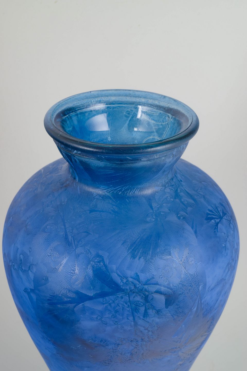 Stor fritblæst gulvvase i blåt kunstglas med levende, skyagtig struktur og let matteret overflade. Elegant balanceret form med bred bug og let indsnævret hals, typisk for europæisk studioglas fra perioden.