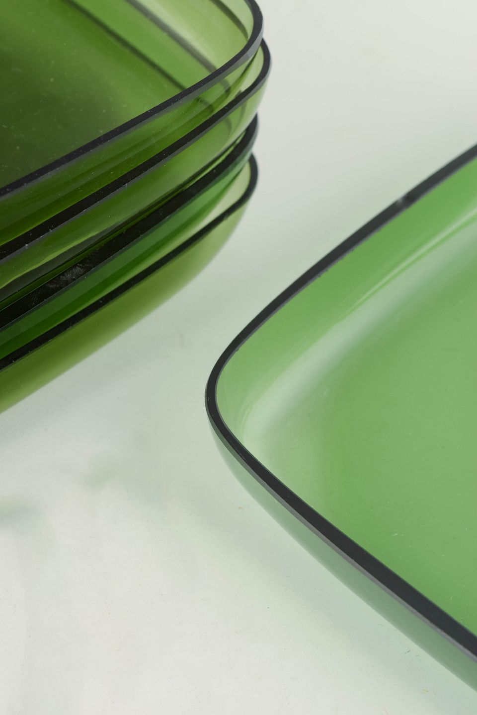 Sæt bestående af fem håndlavede tallerkener i grønt glas med blødt afrundede hjørner og let opadbøjet kant. Et enkelt og funktionelt formsprog med tydelig skandinavisk modernistisk karakter.