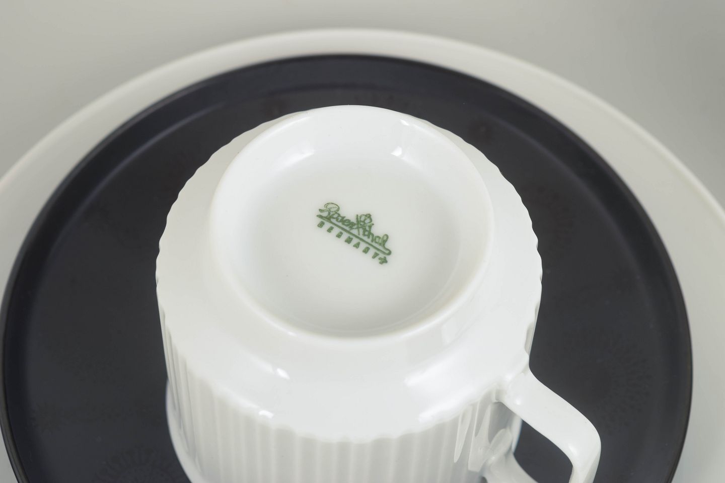 Sæt bestående af to kaffekopper i hvidt porcelæn med karakteristisk rillet overflade, hver med tilhørende underkop i kontrasterende glasur, samt to matchende kagetallerkener. Et funktionelt og stramt formsprog med tydelig nordisk modernistisk karakter.