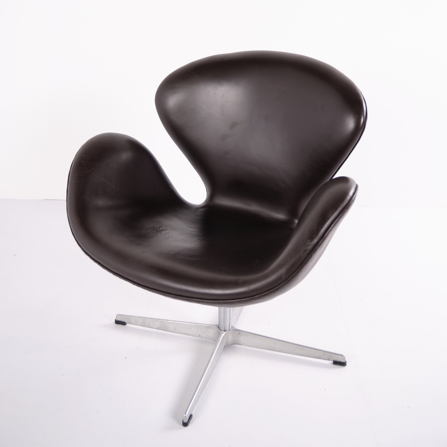 Swan-Sessel Modell 3320, entworfen von Arne Jacobsen und produziert von Fritz Hansen. Ausgeführt in braunem Leder. Produziert im Jahr 2007. Ein ikonischer Klassiker des dänischen Designs.