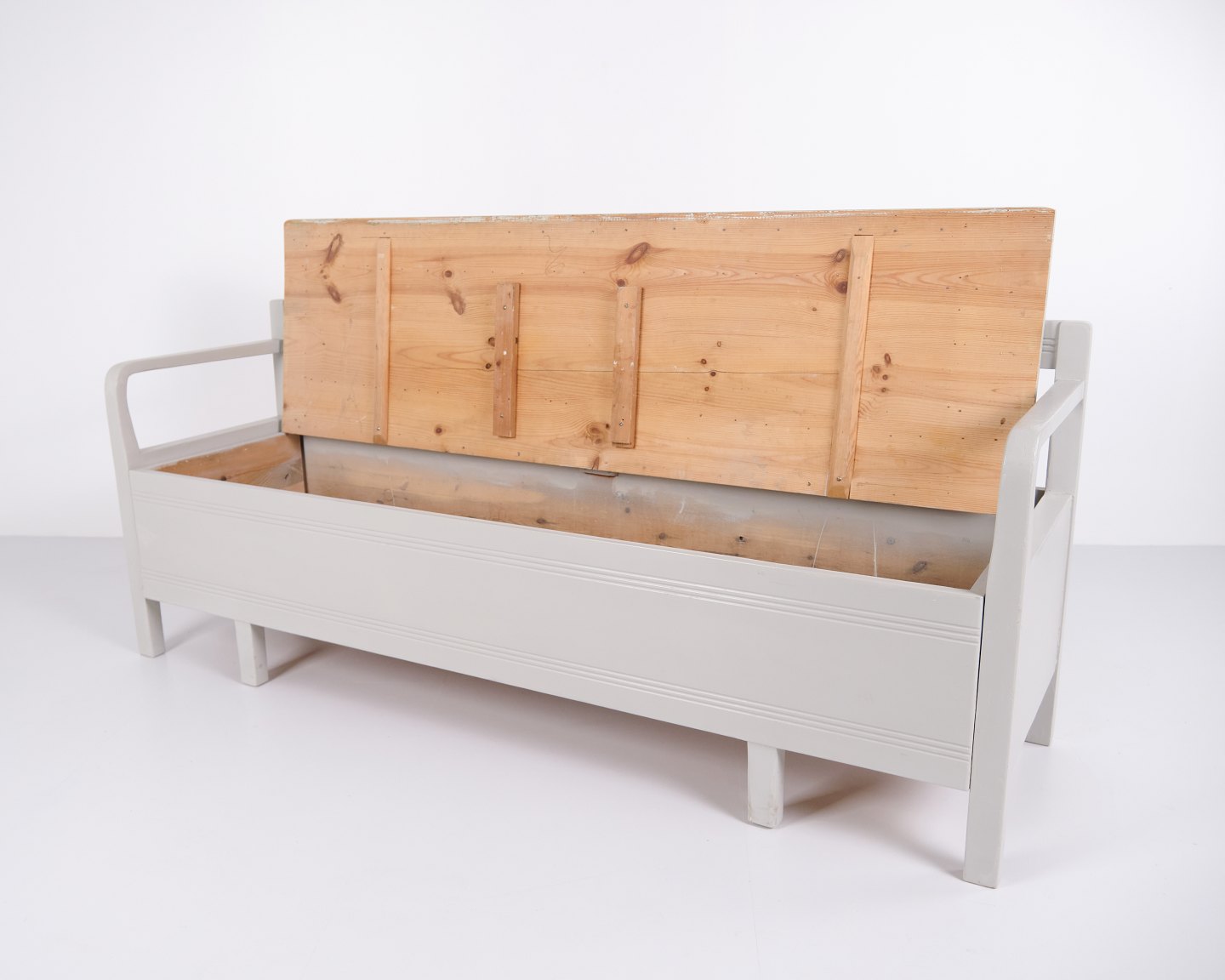 Antike Schlagbank aus den 1860er Jahren aus grau gestrichener Kiefer. Klassisches Volksdesign mit Sitzfläche und Stauraum. Historisches und funktionales Möbelstück.