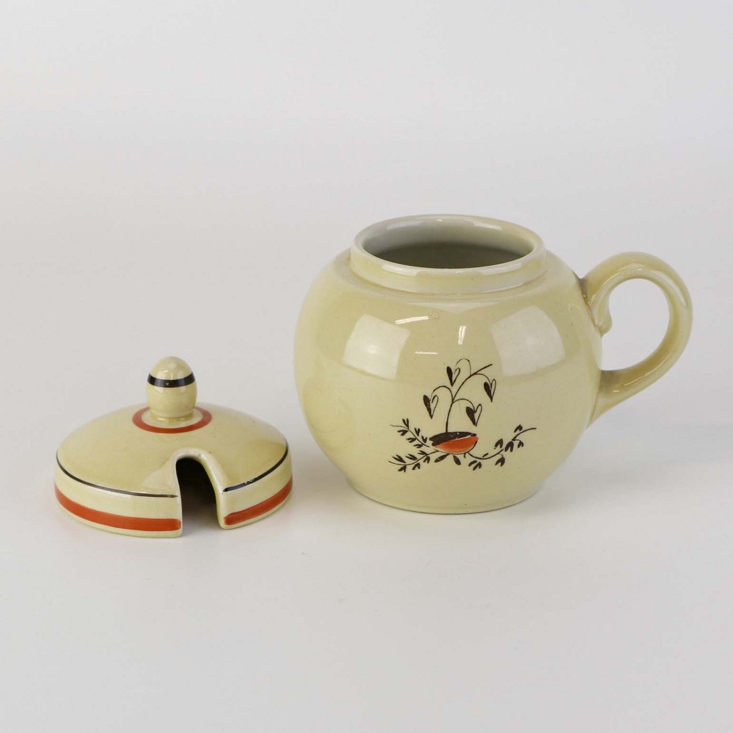 Kop med låg og hank til sennep i fajance fra stellet Silkeborg fremstillet i perioden 1937-1939. Nr. 1765