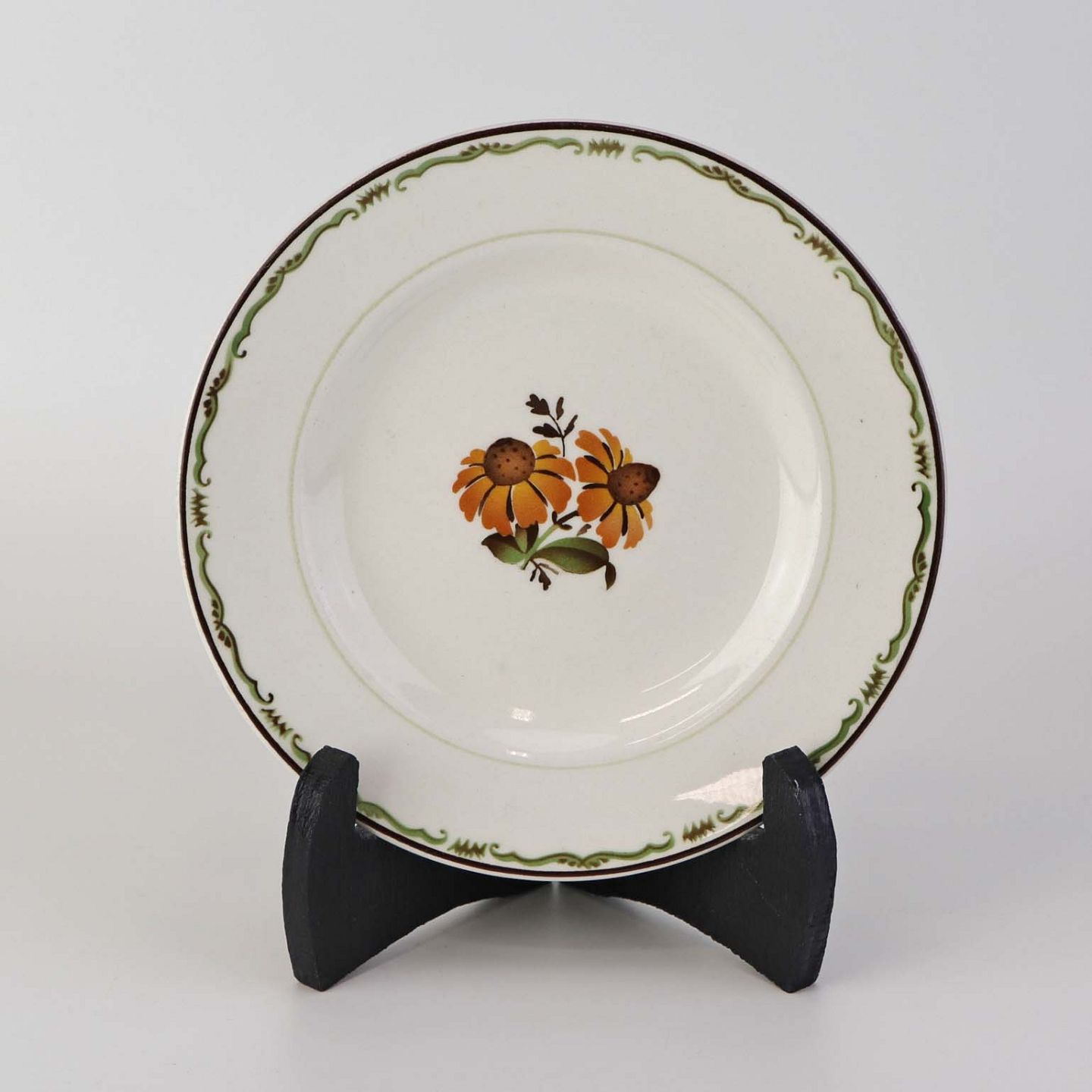Fajancestel i stelform G med dekoration af orangegule blomster og grønne guirlander på lys baggrund med brun kant.
