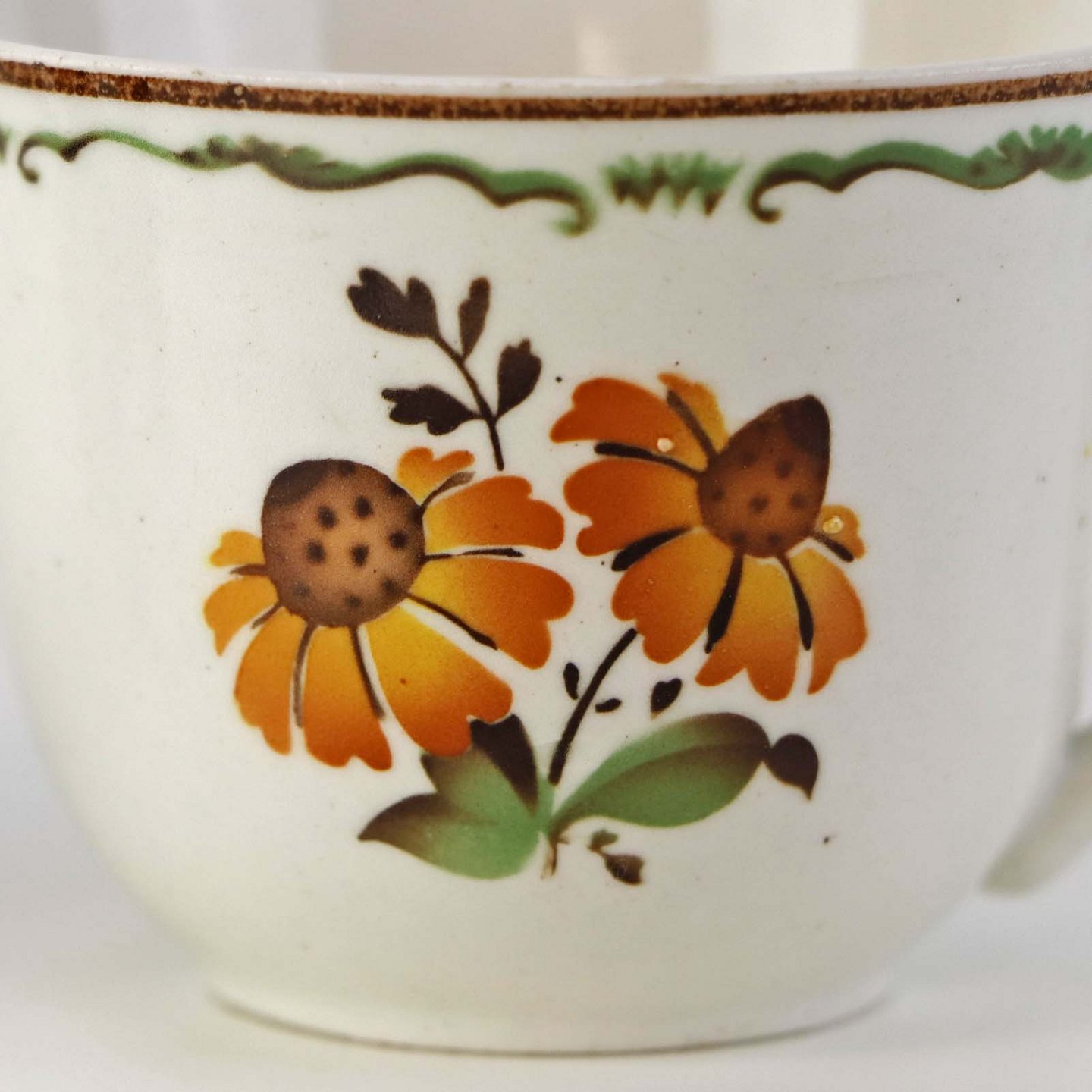 Fajancestel i stelform G med dekoration af orangegule blomster og grønne guirlander på lys baggrund med brun kant.