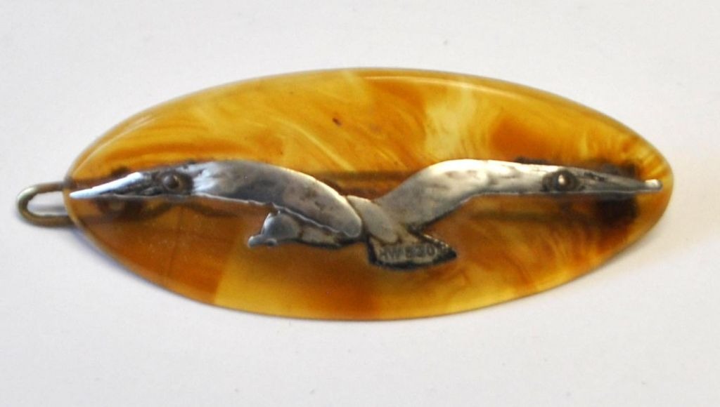 Hanne Emilie Wullum (1923–1937), Kopenhagen, Dänemark: Haarspange aus Schildpatt und Silber. Figur aus Silber in Form einer Möwe mit ausgebreiteten Flügeln. Gestempelt. Länge: 6,5 cm. Höhe: 2,5 cm.