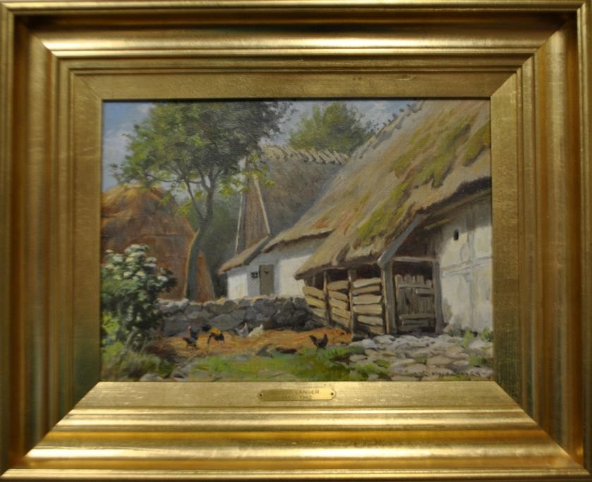 Langer, Viggo (1860–1942) Dänemark: Hühner auf einem Bauernhof. Öl auf Leinwand. Signiert. 24 x 33 cm.