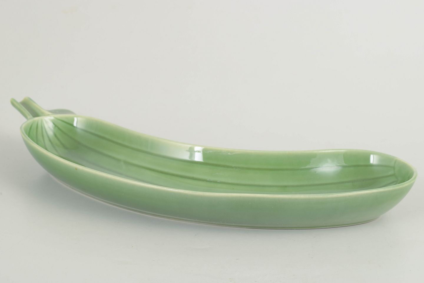 Langstrakt, naturalistisk formet fad i glaseret fajance udført som en agurk, med markante ribber og blank grøn glasur i varierende nuancer. Et karakteristisk og humoristisk design fra Stig Lindbergs sene produktion hos Gustavsberg, udført i 1970’erne. Modellen er kendt som “Cucumber”.