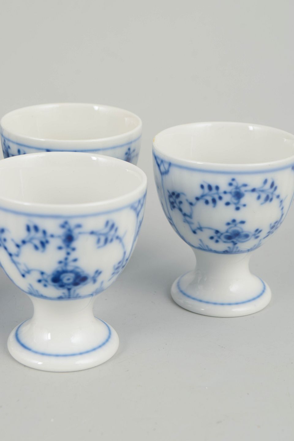 Sæt bestående af fem rillede æggebægre i glaseret porcelæn med håndmalet underglasurdekoration i koboltblå. Klassisk fodet form med let udsvajet kumme. Model 1/2026.