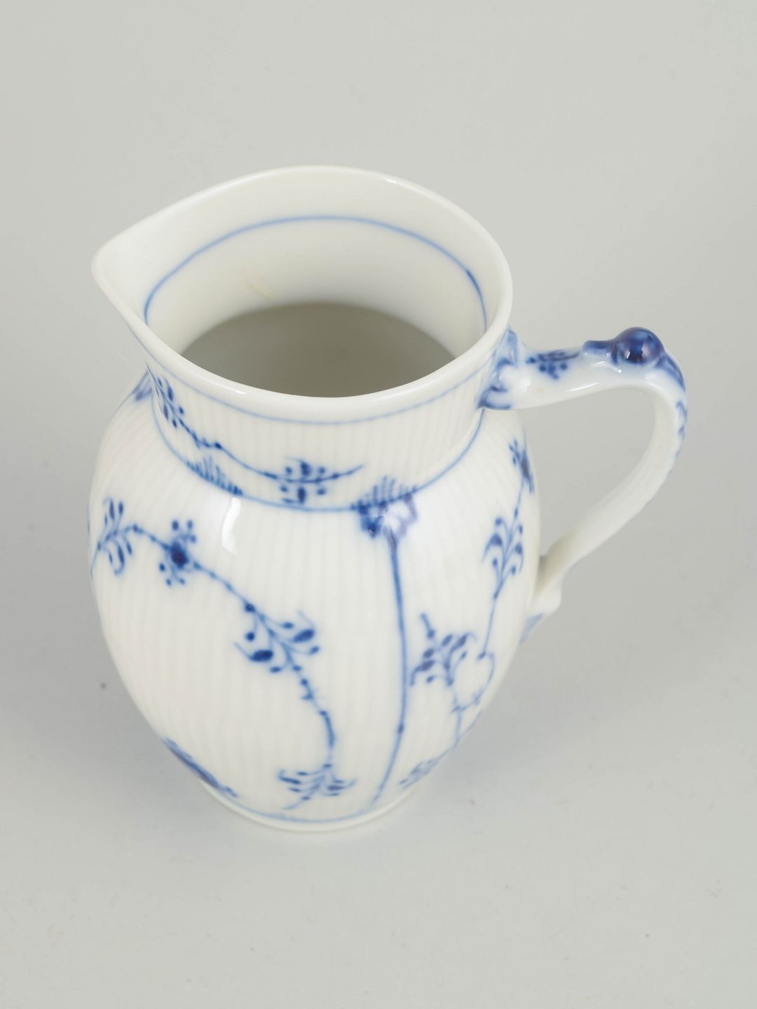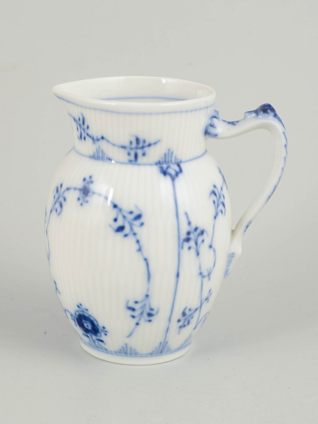 Rillet flødekande i glaseret porcelæn med håndmalet underglasurdekoration i koboltblå. Klassisk balusterform med svunget hældetud og dekorativ hank. Model 1/459.