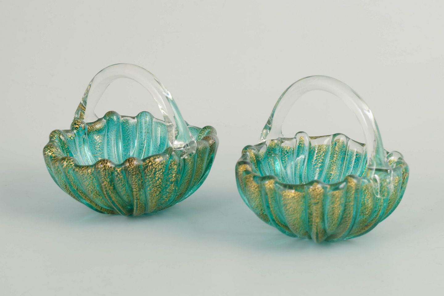 Par dekorative kurve i mundblæst kunstglas med organisk, bølget korpus og klare, opadbøjede hanke. Glasset er udført i turkisgrønne nuancer med gyldne indeslutninger, som giver overfladen dybde og et levende farvespil. Formen og dekorationen er karakteristisk for muranesisk kunstglas fra midten af det 20. århundrede, hvor funktionelle objekter ofte blev udformet som små skulpturelle værker.