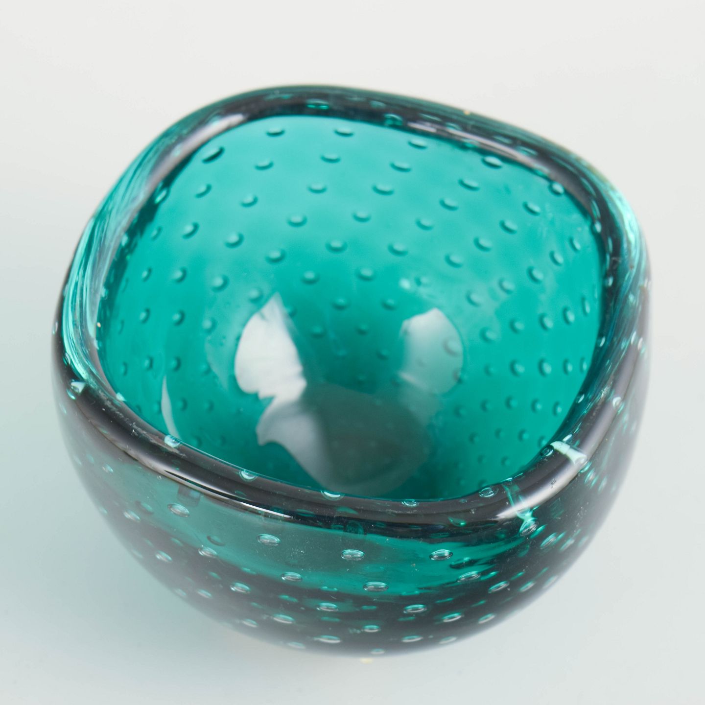 Rund skål i mundblæst glas med dyb turkisgrøn farve og jævnt fordelte luftbobler indkapslet i glasset, udført i klassisk muranesisk teknik. Den let afrundede form og den klare, transparente glasmasse giver et levende spil i overfladen og et elegant, tidstypisk udtryk. Fremstillet hos Venini i Murano i 1960’erne/70’erne.
