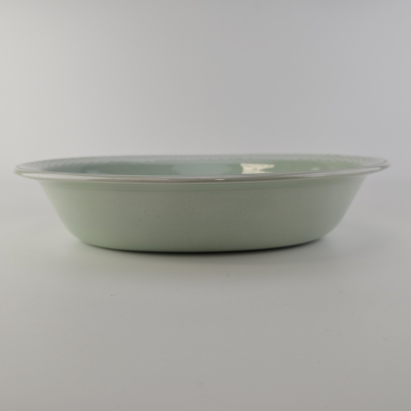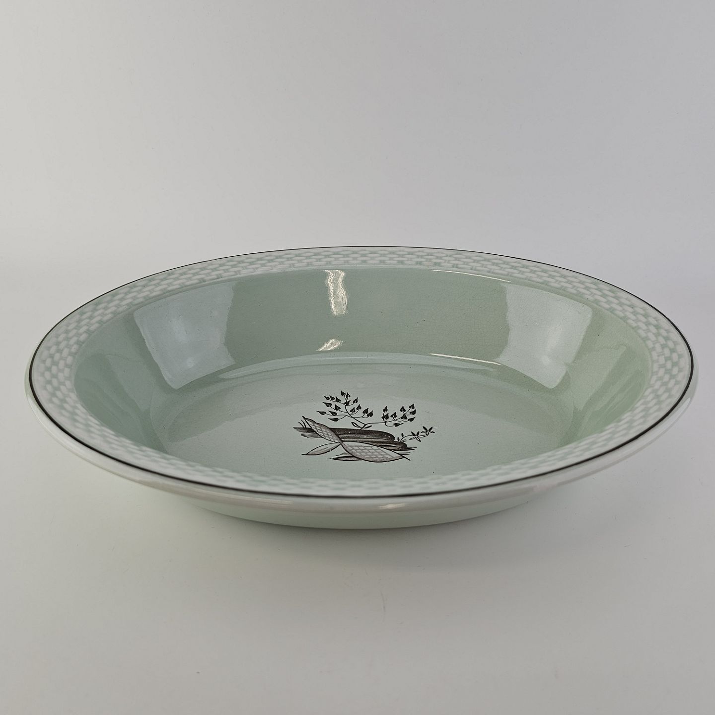 Stel i lysegrøn fajance med natur dekoration og flettet kant