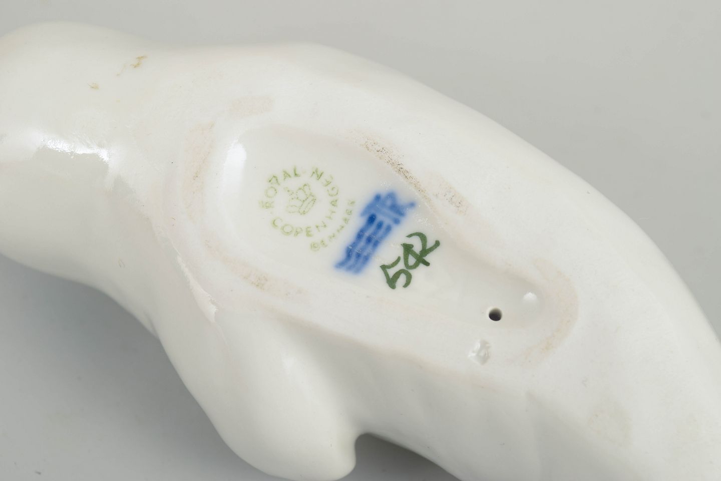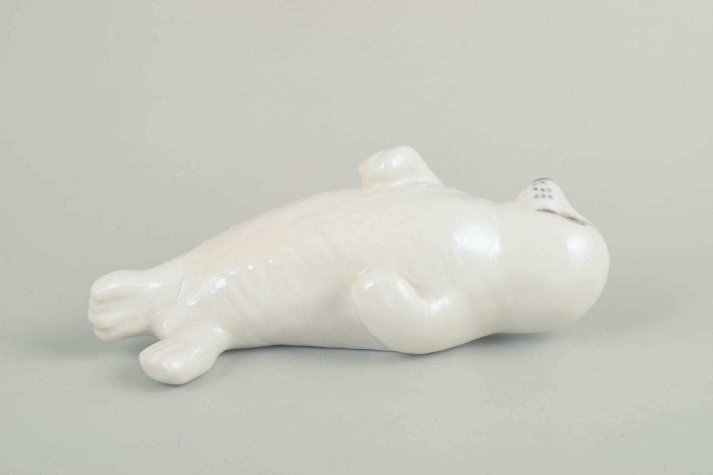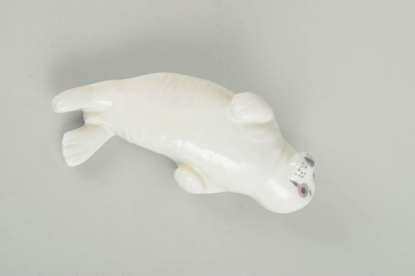 Porcelænsfigur forestillende en liggende sælunge med afrundet, blød modellering og ensfarvet hvid glasur, der fremhæver figurens rolige og naturalistiske udtryk. Model 542.