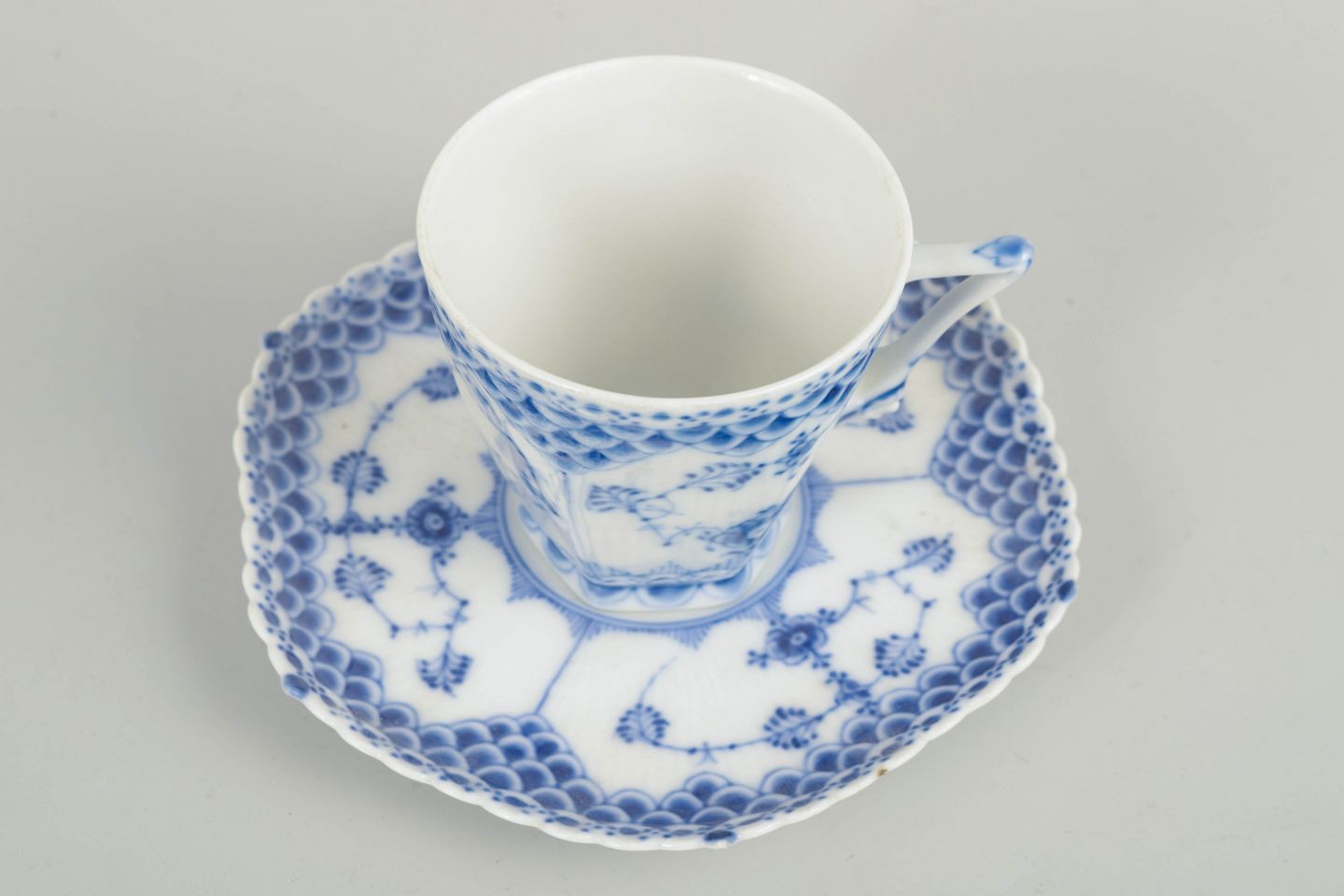 Royal Copenhagen, Musselmalet helblonde kaffekop med underkop.