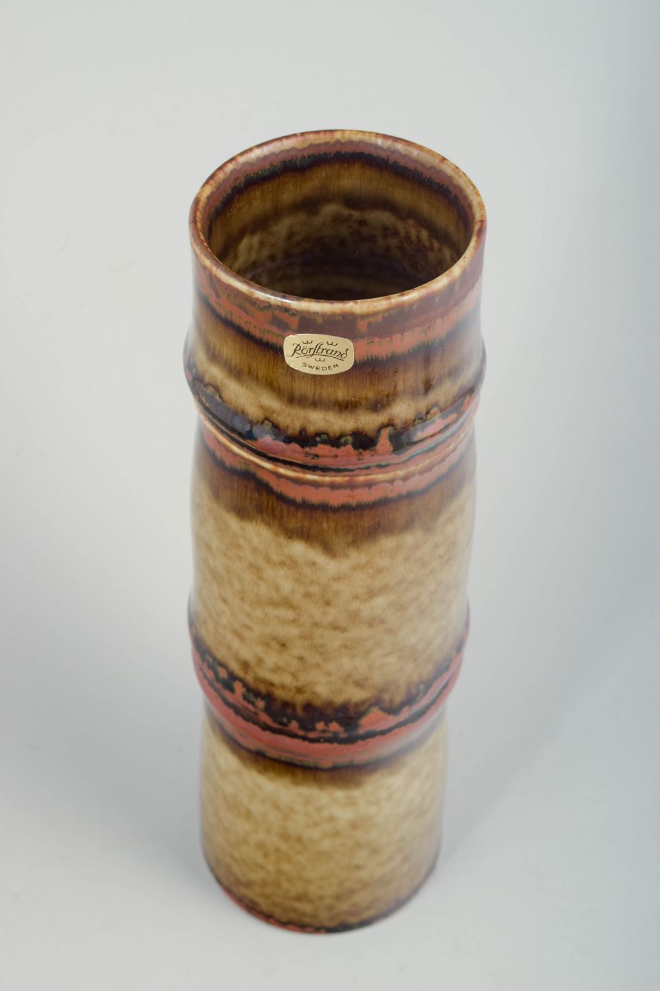 Slank, cylindrisk vase i stentøj med markant lodret formopbygning og let profilerede ringe. Overfladen er dækket af levende, løbende glasurer i varme brune, ravfarvede og beige nuancer med tydelig dybde og variation, karakteristisk for Rörstrands kunstneriske stentøjsproduktion i 1970’erne.