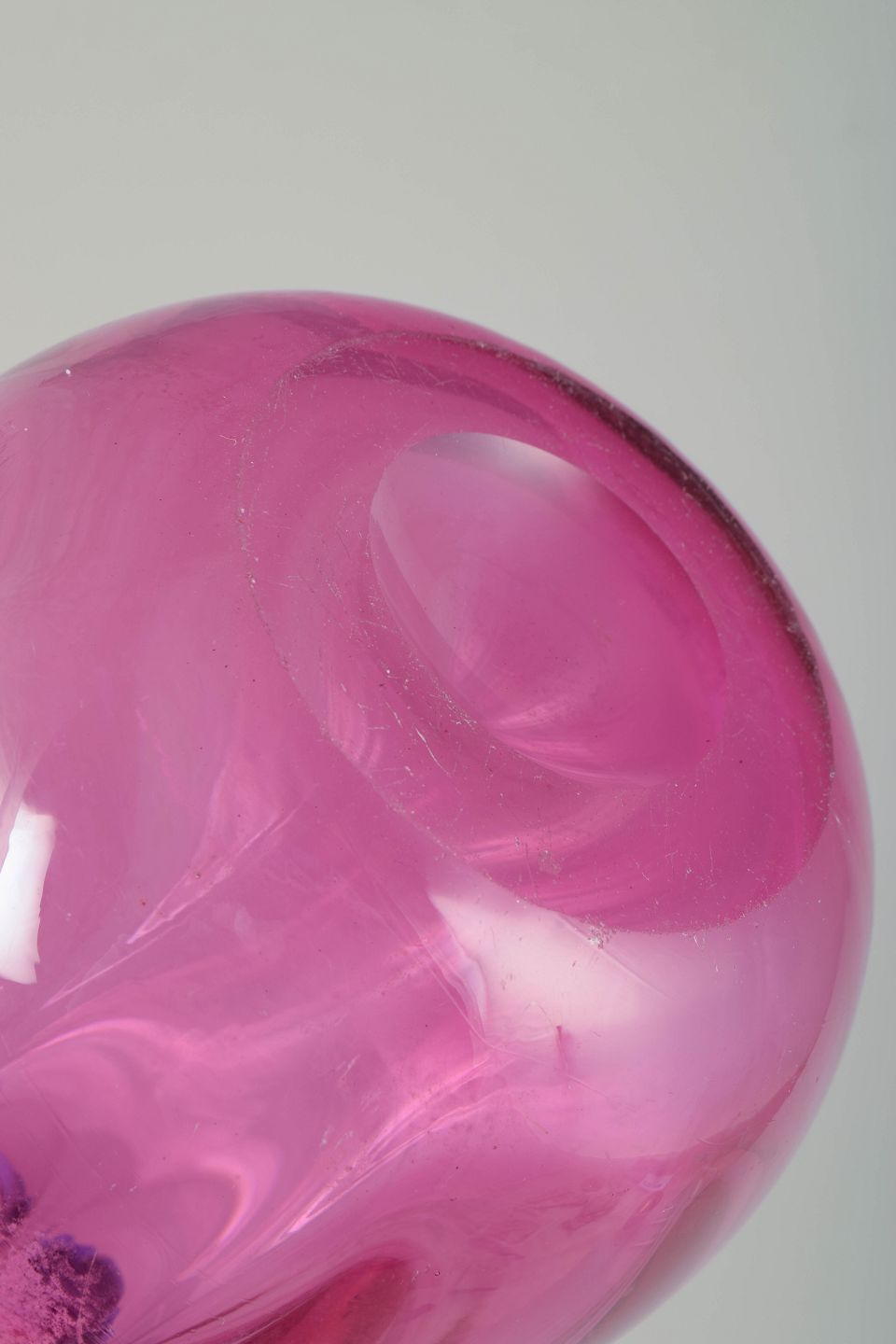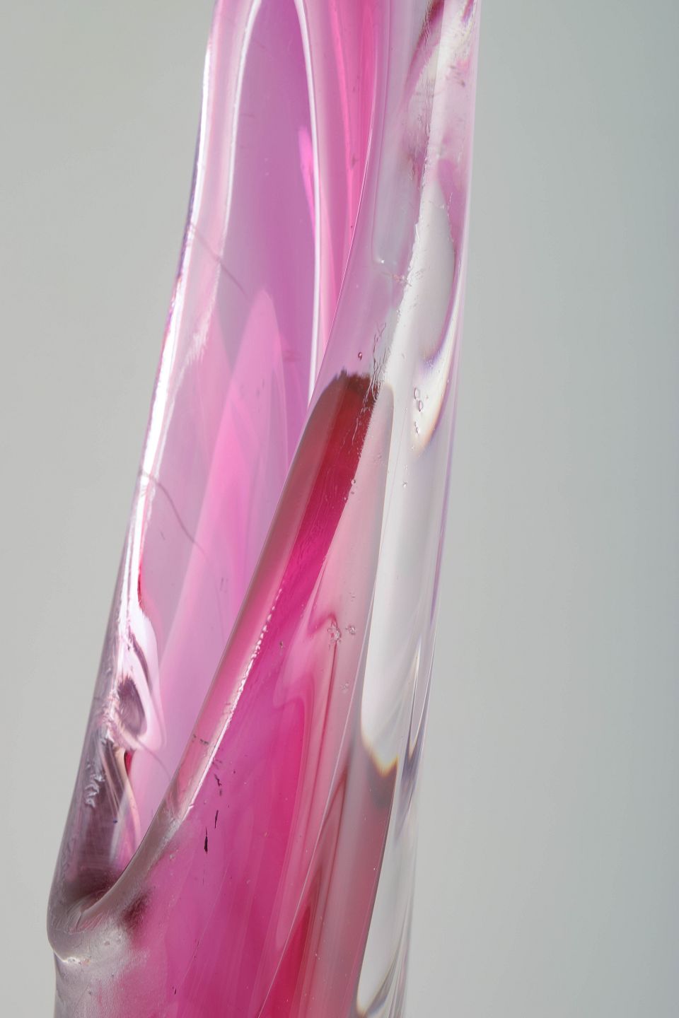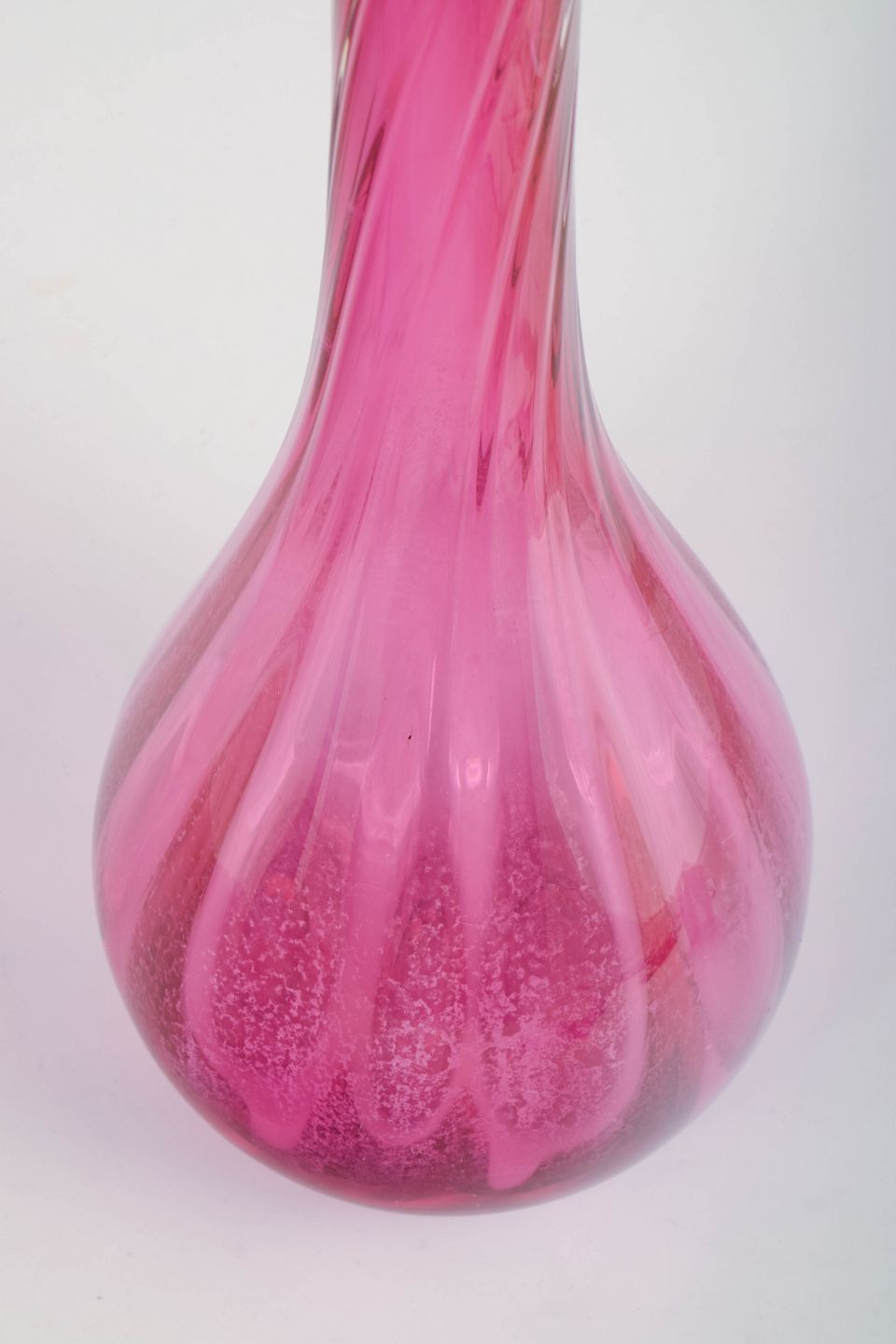 Høj, mundblæst glasvase med slank, opadstrakt hals og dråbeformet korpus. Udført i transparent rosa glas med elegante, snoede optiske striber og let fortykning i bunden, typisk for Murano-produktion fra midten af det 20. århundrede.
