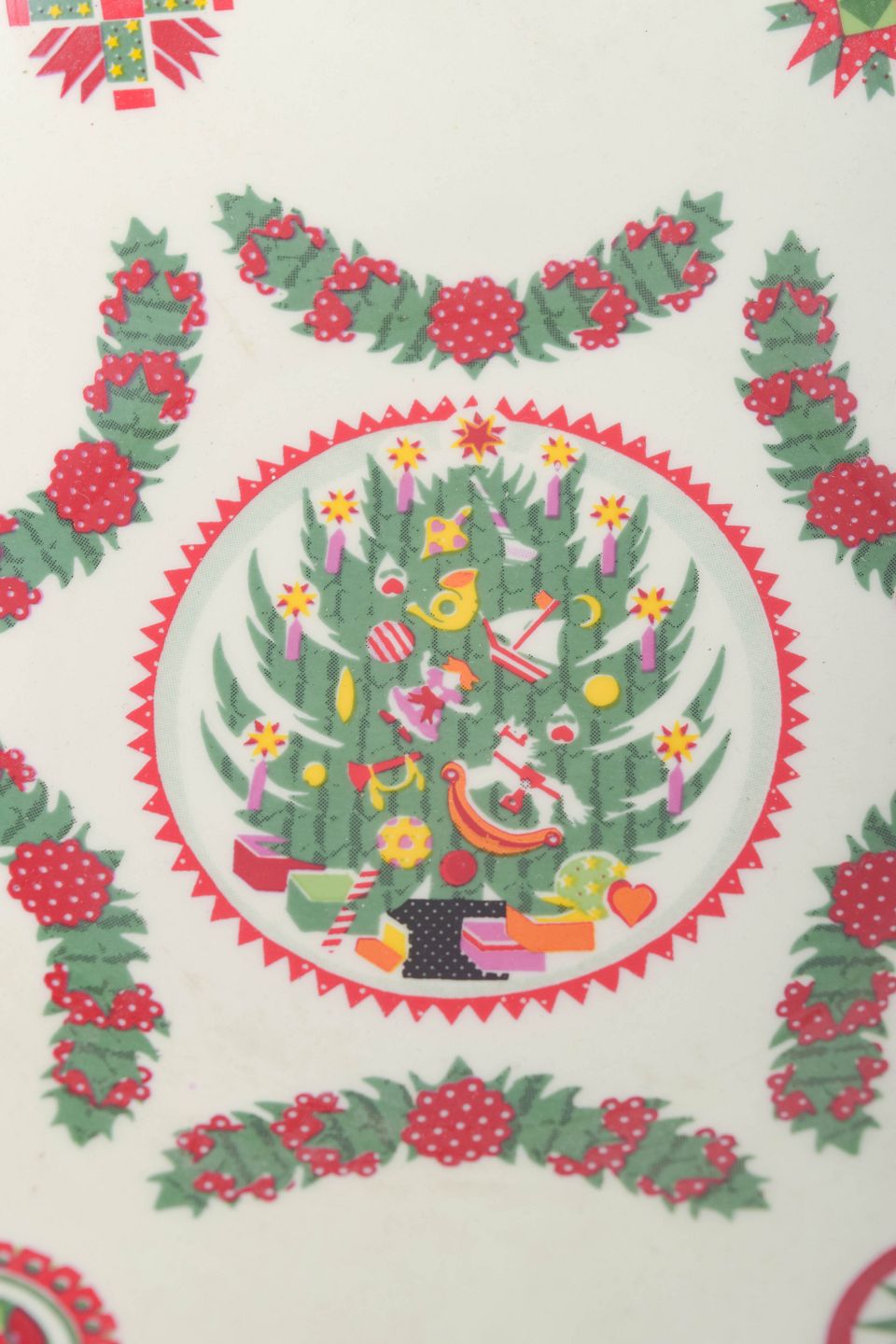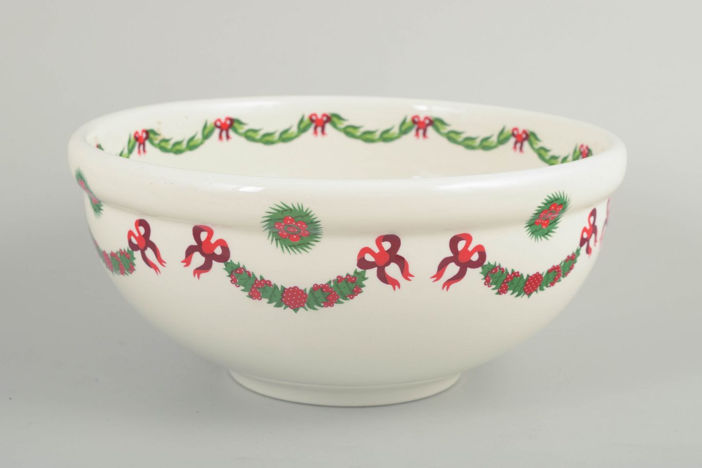 Stor, rund skål i fajance med klassisk juledekoration bestående af guirlander, sløjfer og kristtorn i rød- og grønne toner på lys bund. Skålen har en blød, afrundet form og fremstår med det karakteristiske, dekorative udtryk, som kendetegner Susan Williams-Ellis’ design for Portmeirion.