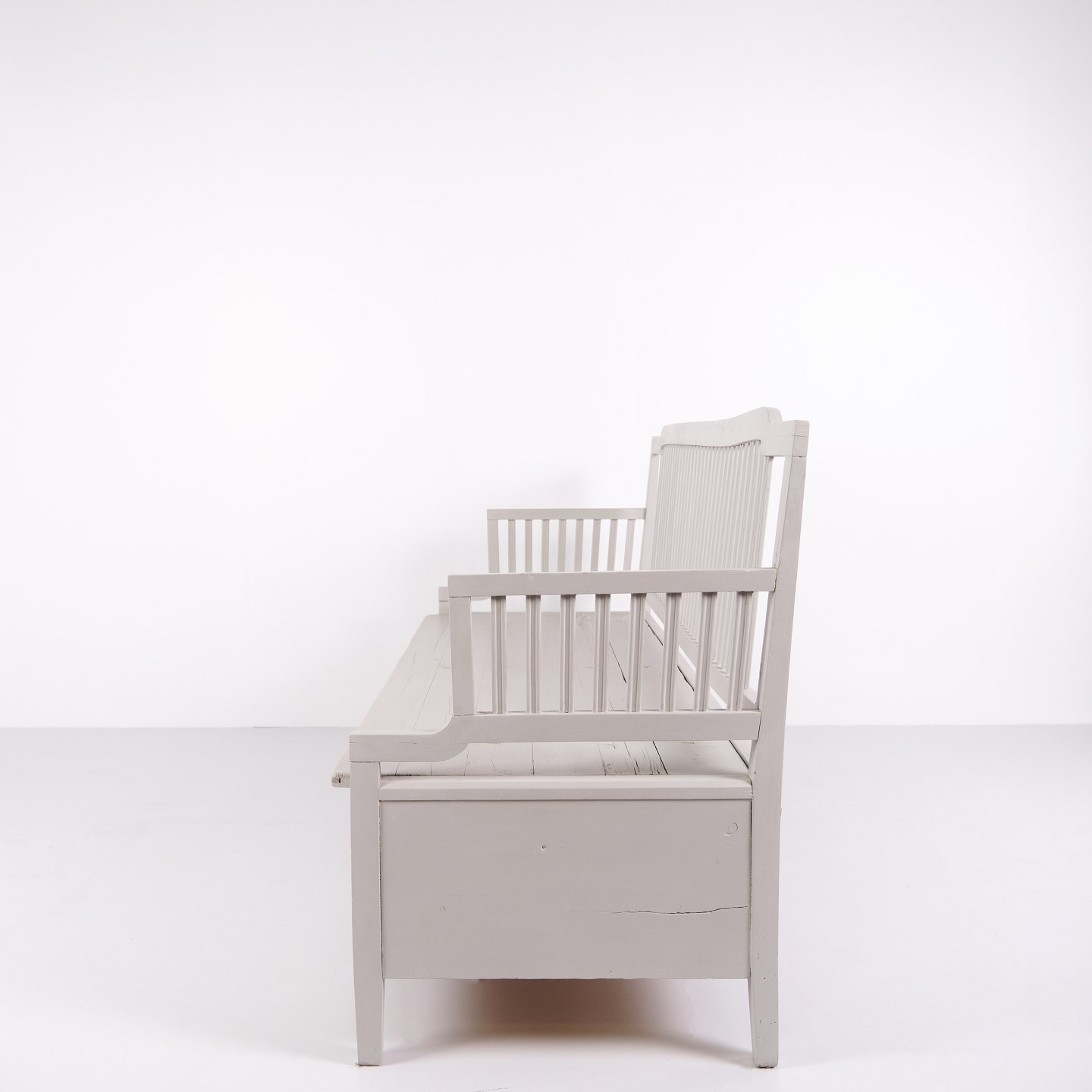 Antike Truhenbank Mit Hoher Rückenlehne – Grau Lackiert – Kiefernholz – 1860er Jahre