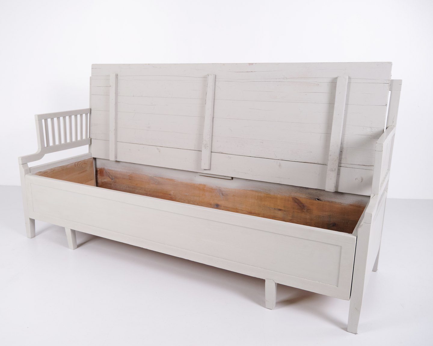 Antike Truhenbank aus den 1860er Jahren aus grau lackiertem Kiefernholz mit hoher Rückenlehne und Aufbewahrung. Antike Aufbewahrungsbank aus dem 19. Jahrhundert.