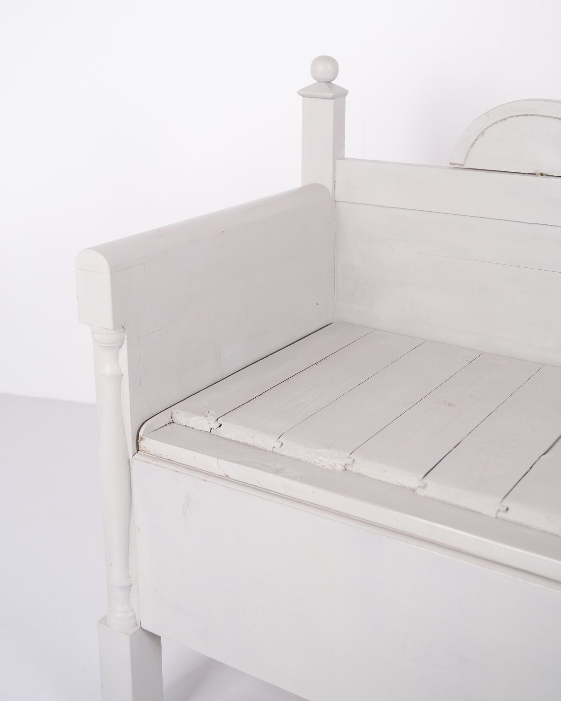 Antike Truhenbank aus den 1860er Jahren aus grau lackiertem Kiefernholz mit geschnitzten Details und Aufbewahrung. Antike Aufbewahrungsbank aus dem 19. Jahrhundert.