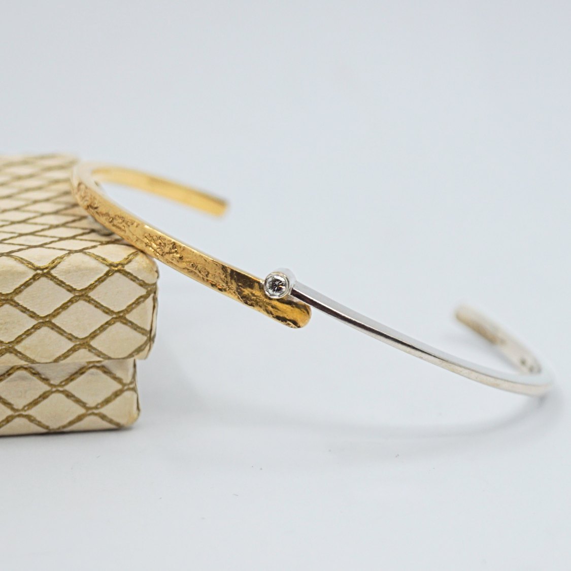 Text zugänglich auf Dänische: Guldarmring i 14 kt. hvidguld og guld, prydet med diamant i midten. Indvendige mål 5,6 cm x 5 cm. Designet med både glat og materet overflade i guldet.