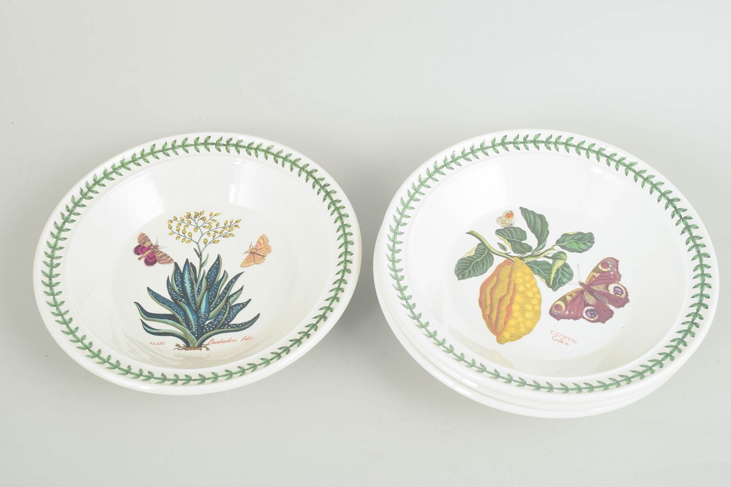 Portmeirion er en engelsk producent kendt for dekorativt stentøj og fajance med naturinspirerede dekorationer. “The Botanic Garden” serien tager udgangspunkt i klassiske botaniske illustrationer gengivet i klare farver og kombineret med en grøn bladbort, hvilket har givet serien et tidløst udtryk og gjort den populær blandt samlere gennem flere årtier.