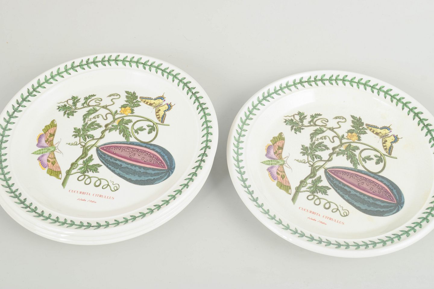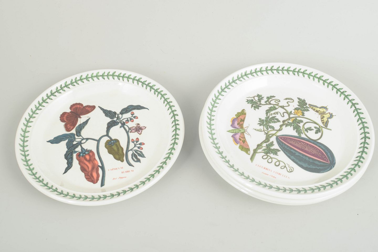 Sæt med 4 frokosttallerkener i fajance fra Portmeirion, dekoreret i “The Botanic Garden” serien med botanisk motiv og karakteristisk grøn laurbærbort.