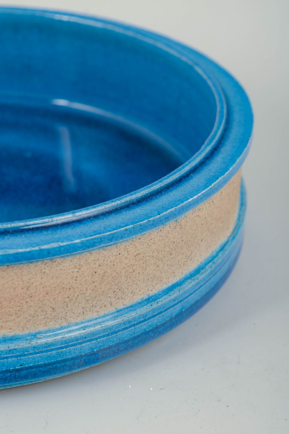 Lav, rund skål i drejet stentøj med blank blå glasur og sandfarvet, uglaseret bælte. Enkel og funktionel formgivning, karakteristisk for dansk stentøj fra 1960’erne.