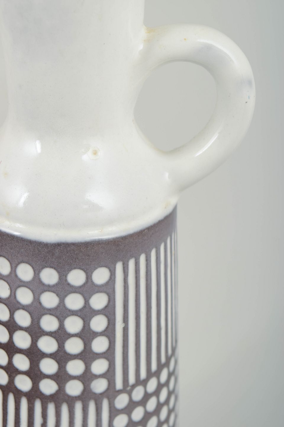 Høj, slank kande i glaseret keramik med smal hals og enkelt hank. Underdelen er dekoreret med et stramt, grafisk mønster af prikker og lodrette linjer i hvid mod brun bundglasur, mens overdelen er udført i hvid glasur. Det rytmiske dekorationsfelt giver kanden et klart modernistisk udtryk. Modelnummer 4564.