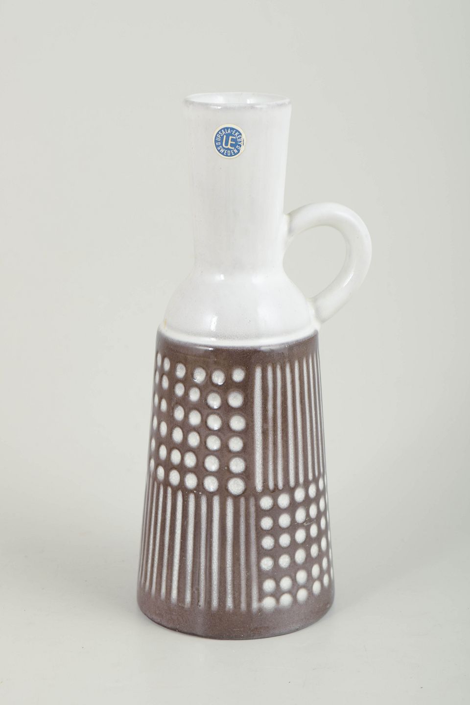 Slank, cylindrisk kande i glaseret keramik med smal hals og enkelt hank. Underdelen er dekoreret med grafiske prik- og stregmønstre i hvid mod brun bundglasur, mens den øvre del er udført i hvid glasur. Dekorationen fremstår stram og rytmisk med et tydeligt modernistisk udtryk. Modelnummer 4563.