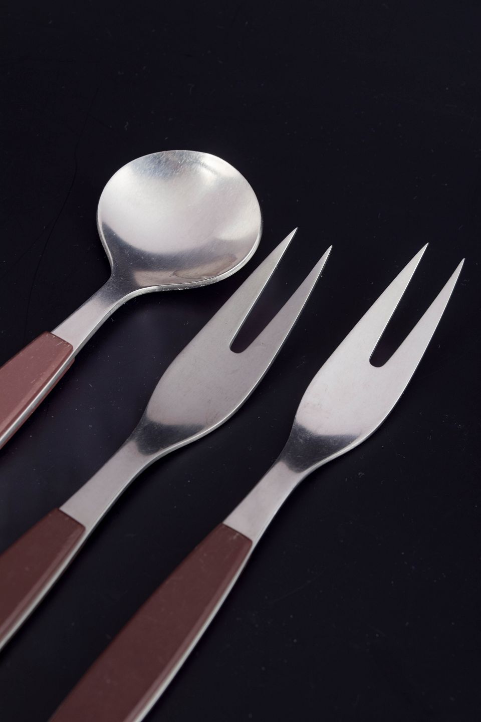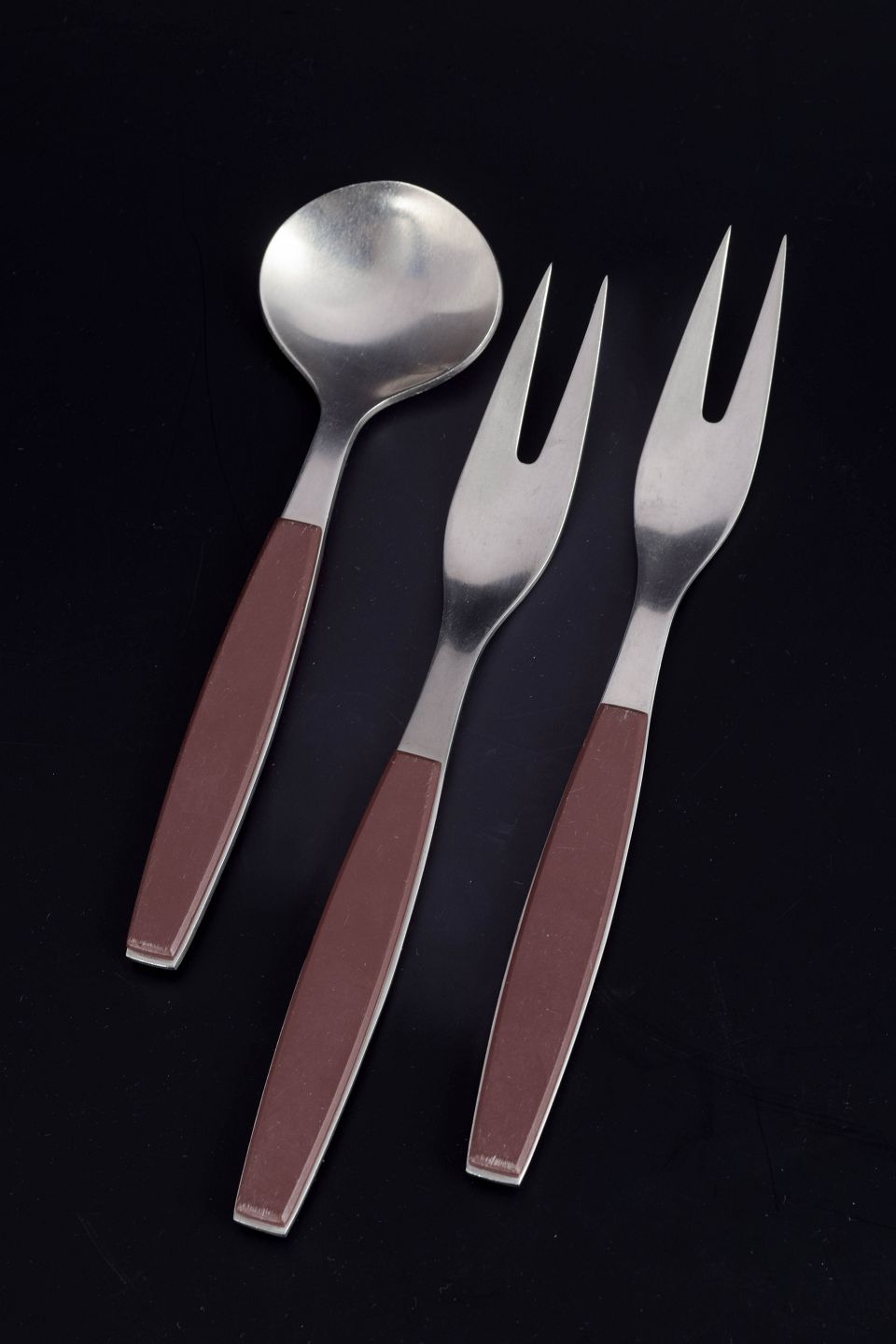 Sæt bestående af to pålægs-/serveringsgafler og en bouillonske i rustfrit stål med brune håndtag. Modellen er fra Strata-serien.