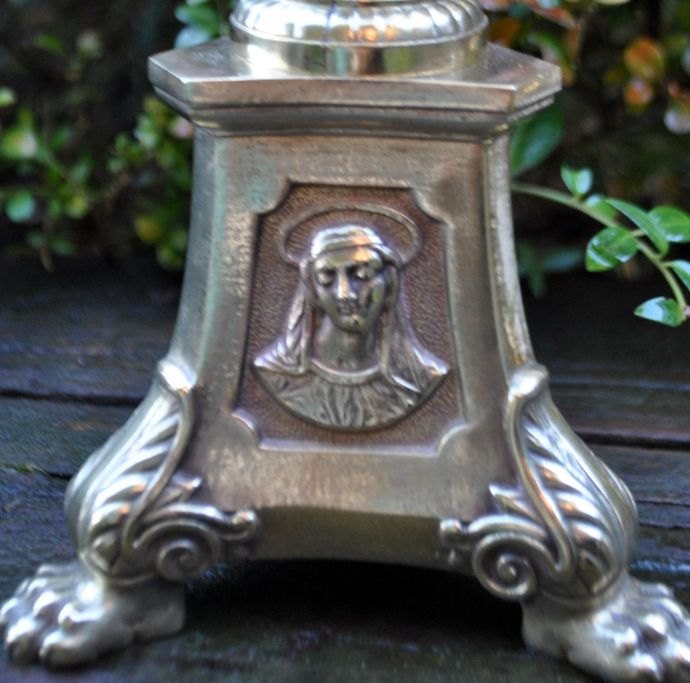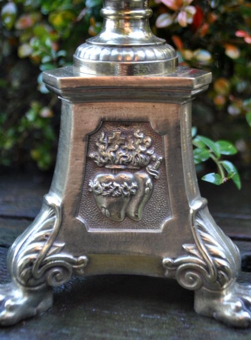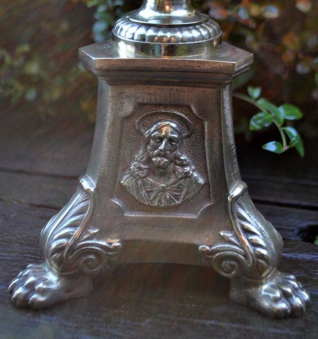 Französischer Kirchenleuchter aus Messing, 19. Jahrhundert. Dreieckiger Sockel mit Löwenfüßen und Motiven von Jesus, der Jungfrau Maria und brennenden Herzen. Gestempelt: LF a Paris. Höhe: 46 cm. Breite: 12,5 cm.
