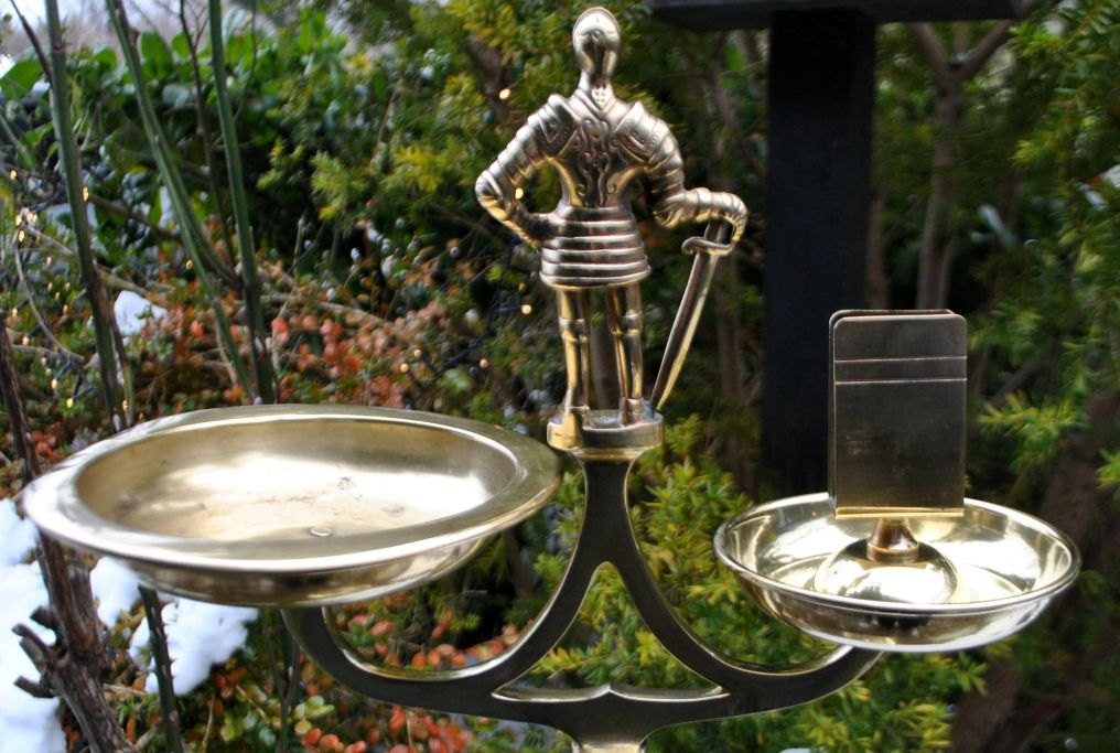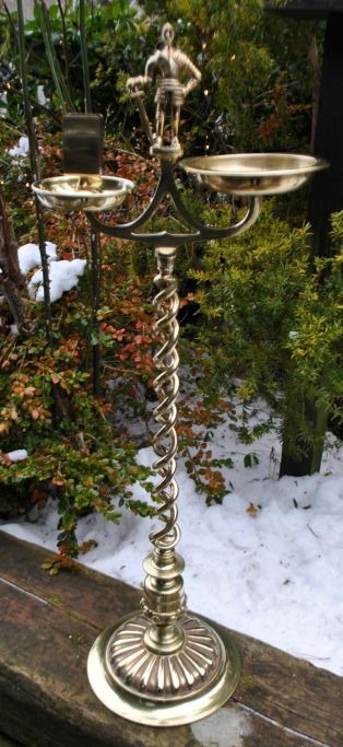 Messingständer mit Aschenbecher und Streichholzhalter, 19. Jahrhundert. Mit doppelt gedrehter Säule und einer Ritterfigur in Rüstung als Abschluss. Auf rundem Fuß. Höhe: 86 cm. Breite: 32 cm.