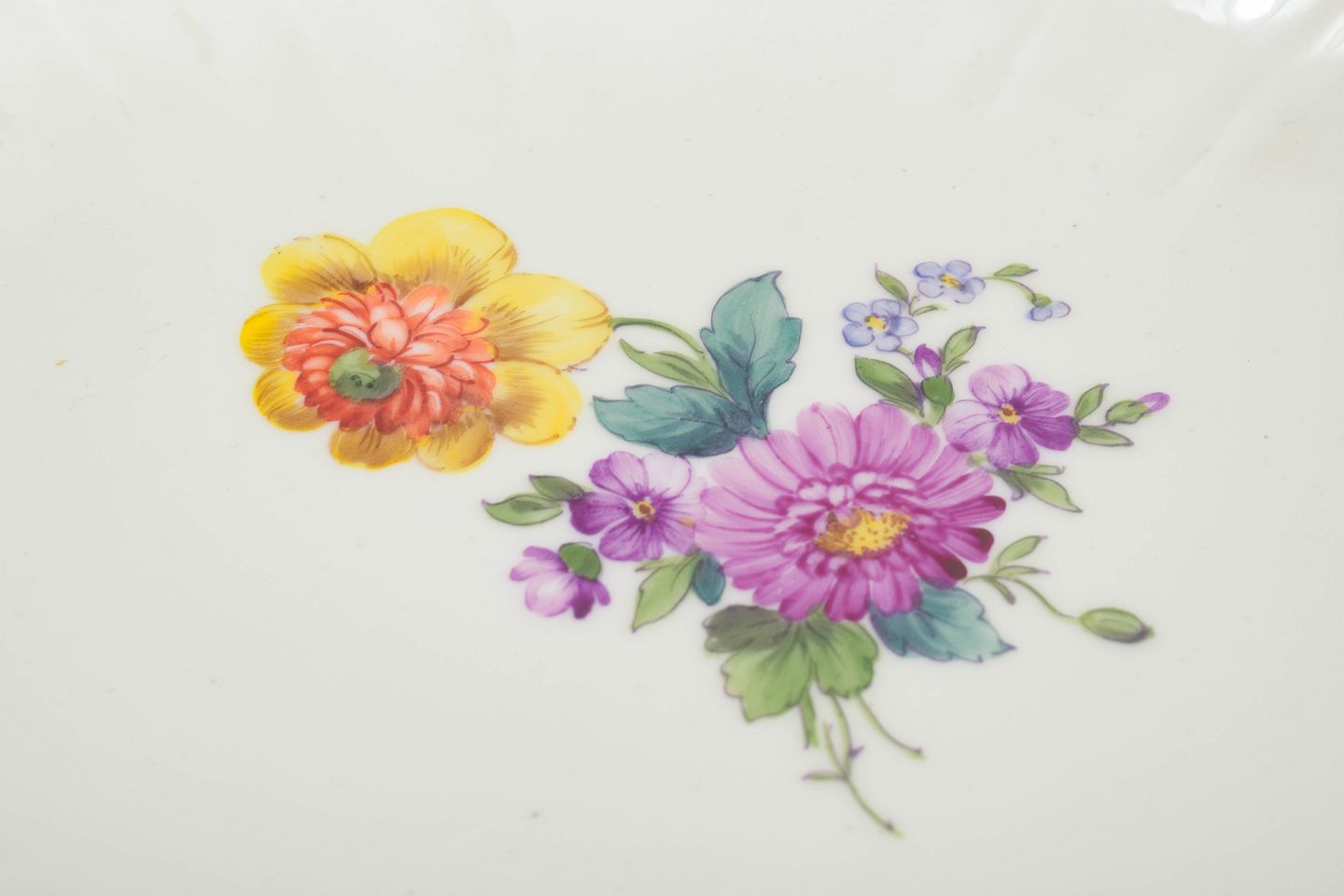 Stort ovalt serveringsfad i hvidglaseret porcelæn med håndmalet blomsterdekoration i serien Saksisk Blomst og forgyldt kant; model 4/1555.