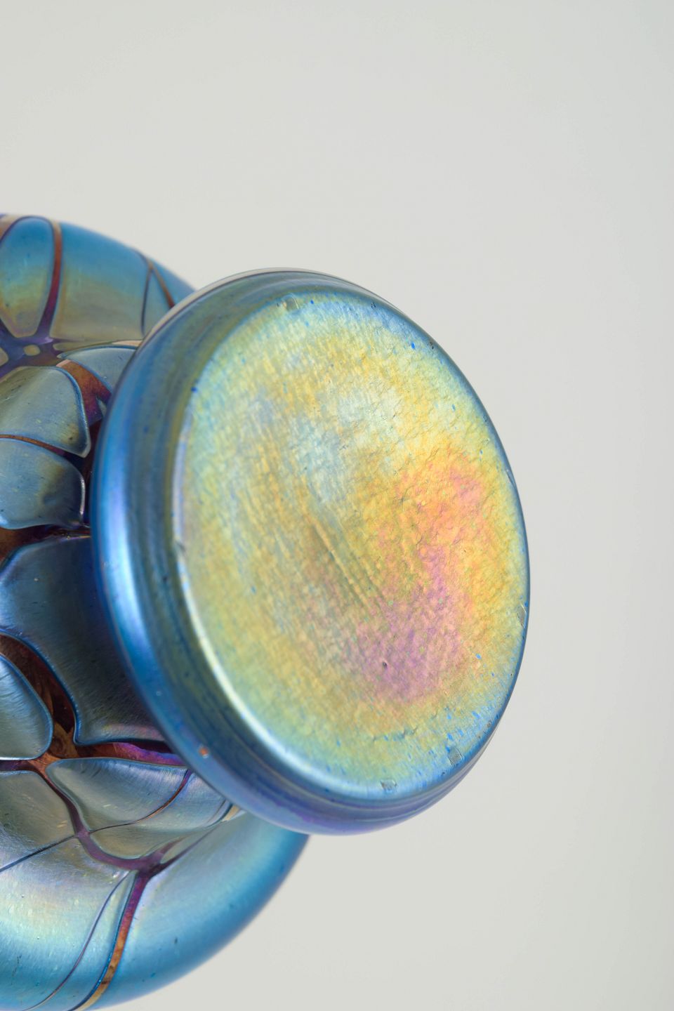 Dekorativ Art Nouveau-vase i iriserende kunstglas med blåviolet skær og organiske, “flydende” tråd-/åremønstre i overfladen. Formen er balusterpræget med bred, lav bug og smal hals; modelleringen fremhæver glassets farvespil og lysrefleksioner.